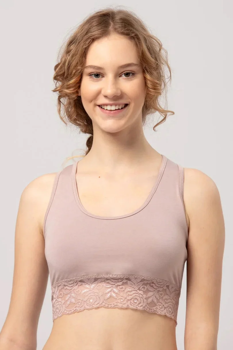Wygodny bambusowy sportowy top wykończony mięciutką i elastyczną koronką dla kobiet, które cenią wygodę i cudowną miękkość w każdy dzień roku.Z przodu podwójna warstwa dzianiny doskonale okala biust. Dodatkowo tworzy miejsce na wyjmowaną miseczkę. Pod biustem miękka 3 cm guma. Dekolt i ramiona wykończone miękką lamówką. Z tyłu lamówki ramiączek krzyżują się co zapobiega opadaniu ramiączek i daje pełną swobodę i pewność przy każdym ruchu. Prawie niewyczuwalna, nie podrażnia skóry i jest aksamitna w dotyku. Doskonale sprawdzi się zwłaszcza podczas upałów - przepuszcza powietrze blisko skóry, pozostawiając kojące uczucie chłodu. Włókno bambusowe jest wyjątkowo trwałe, lekkie i delikatne, a dzięki dodatkowi elastanu bielizna pięknie przylega do ciała.