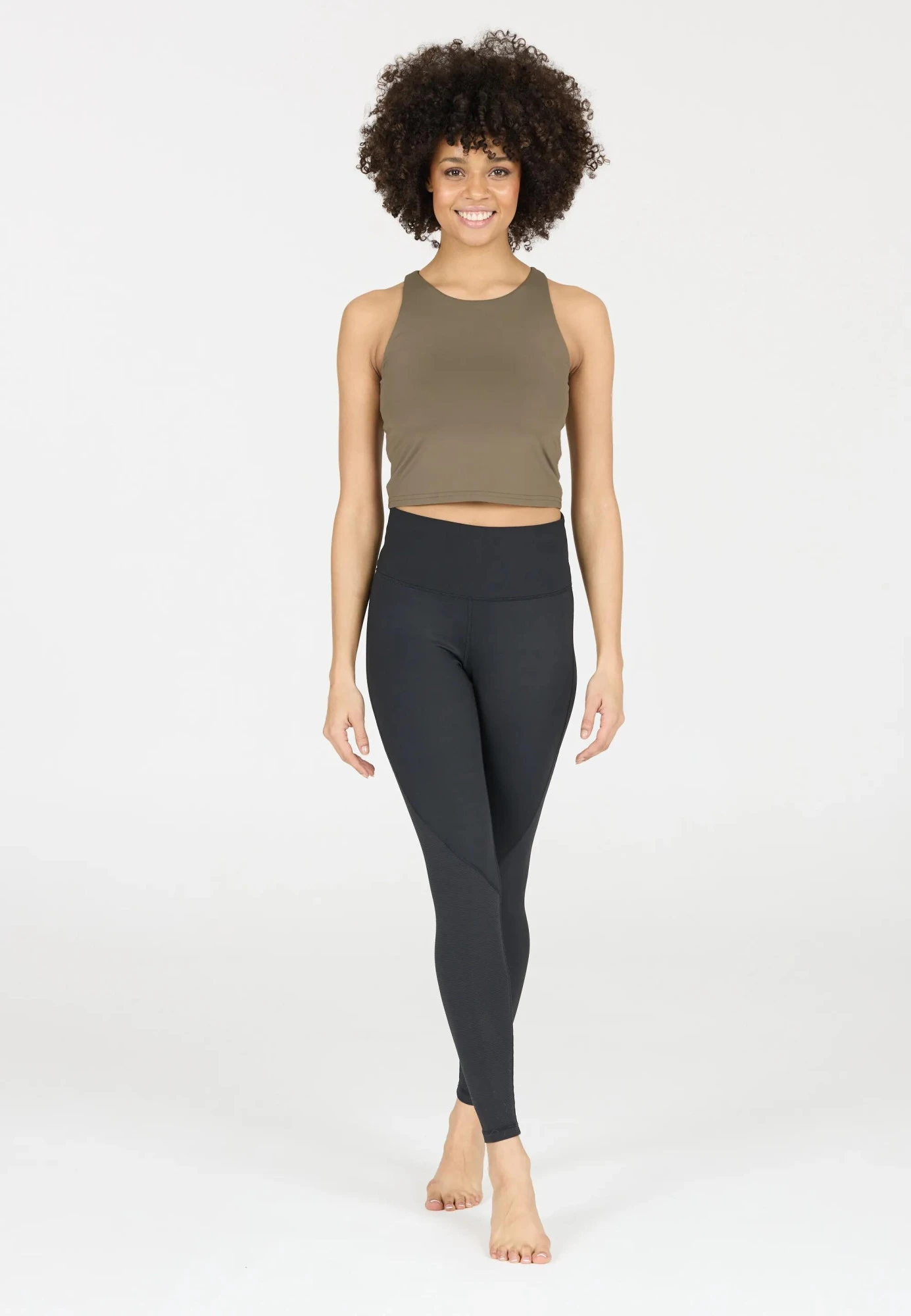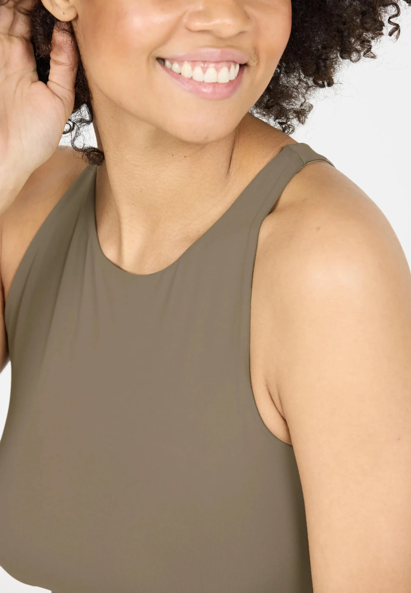 Přiléhavý střih s vysokým kulatým výstřihem perfektně obepne tělo a poskytuje oporu i pohodlí při jakémkoli pohybu.