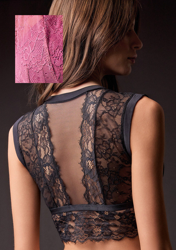 Elegantní krajkový top Lormar spojuje jemnost, smyslnost a moderní design. Přední část zdobí výrazná krajka doplněná transparentním tylem, který vytváří působivý dekolt a dodává celému modelu lehkost. Zadní díl je tvořen kombinací jemné krajky a průsvitného tylu, což zajišťuje vzdušnost a rafinovaný vzhled. Top je navržen bez kostic pro maximální pohodlí a přirozený pocit při nošení. Dostupná růžová varianta odpovídá odstínu z ukázkových fotografií.