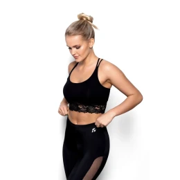 Dámský sportovní top. Ušitá z kvalitní bavlny s přídavkem elastických vláken. Má tenká, dvojtá ramínka, na zádech zkřížená. Spodní část je zdobená pruhem krajky. Vzadu logo.