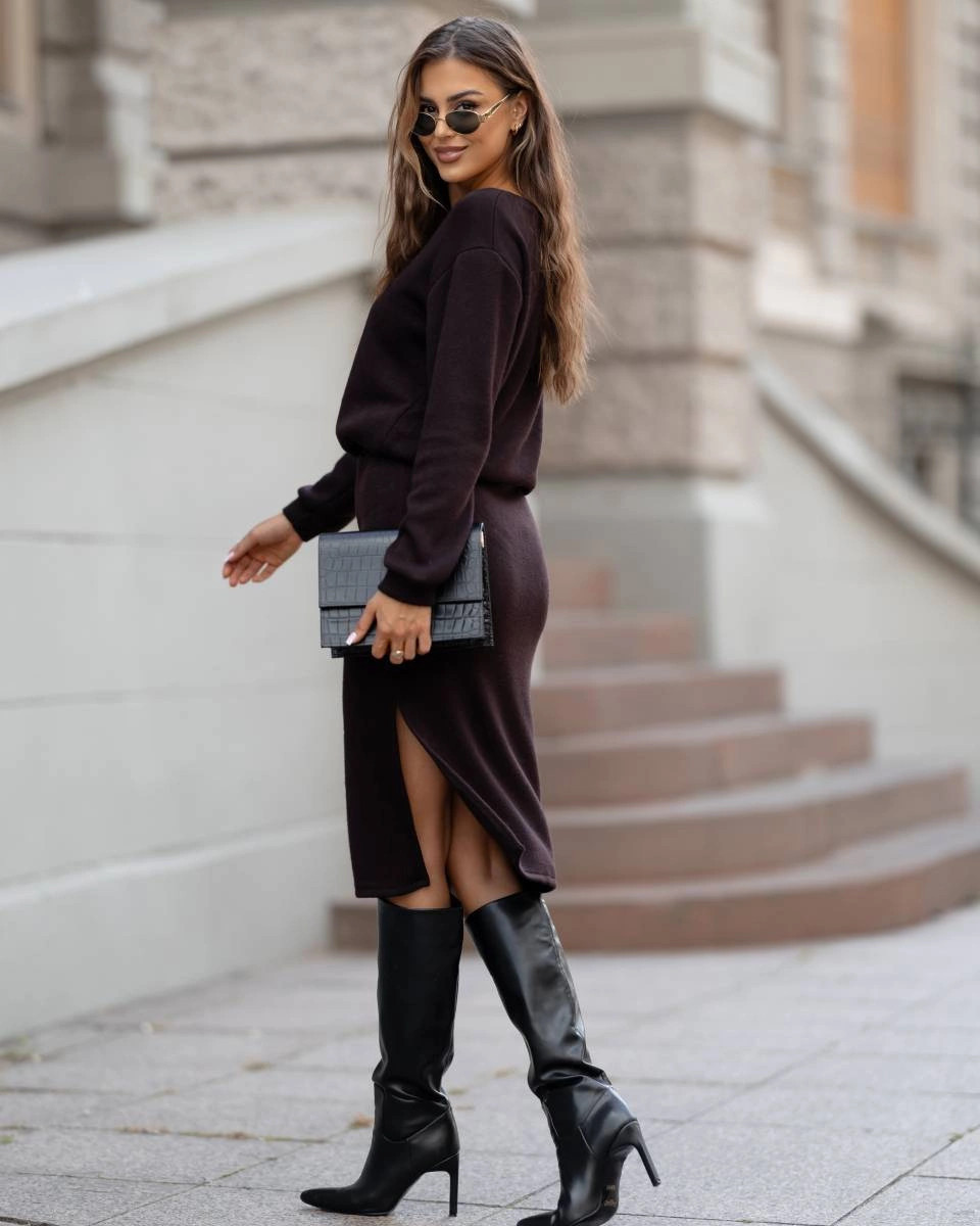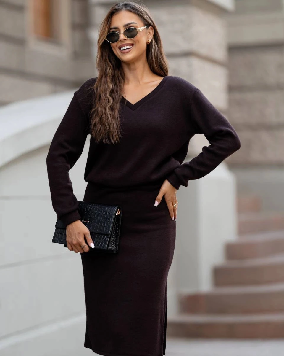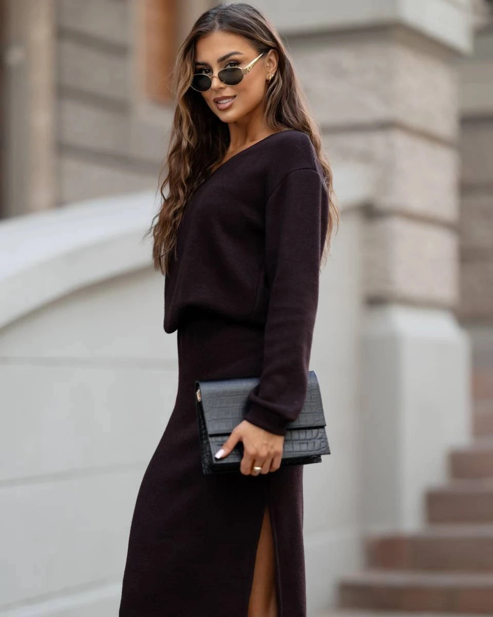 Dámský úpletový komplet v čokoládové barvě se sukní (82103)