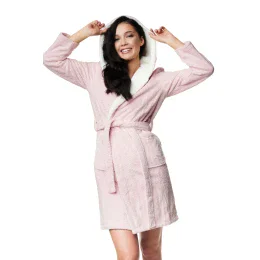Krátký hřejivý dámský župan s jemným reliéfním vzorem. Je vyroben z látky příjemné na dotek a bude ideální pro první chladné večery. Celý v jemných barvách. Kapuce je podšitá bílým kožíškem, který přechází i do vnitřního výstřihu. Pásek elegantně zvýrazňuje pas. Dvě kapsy na bocích. Složení: 100% polyester.