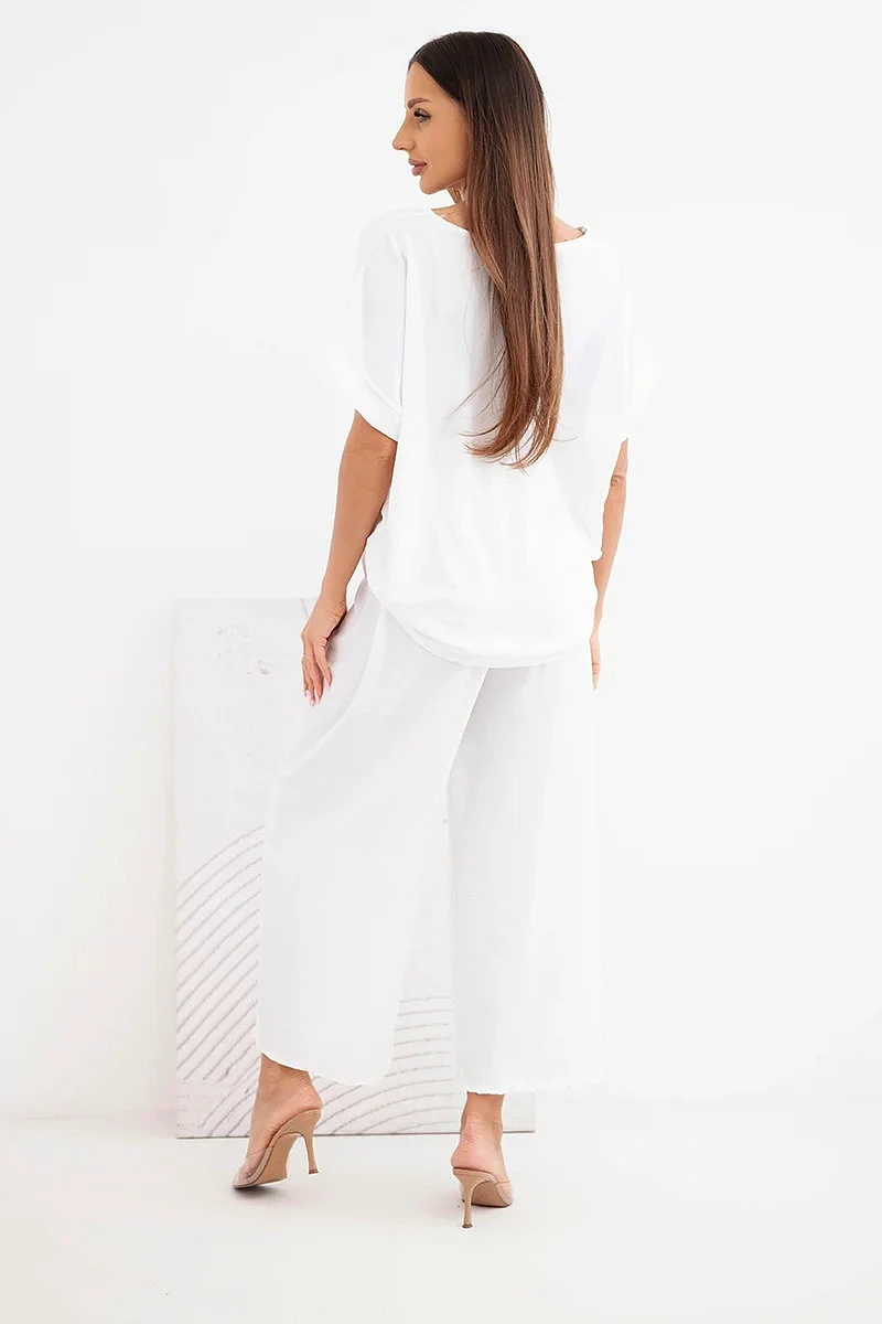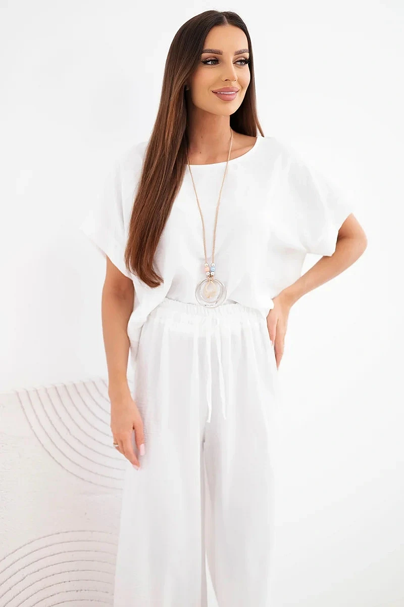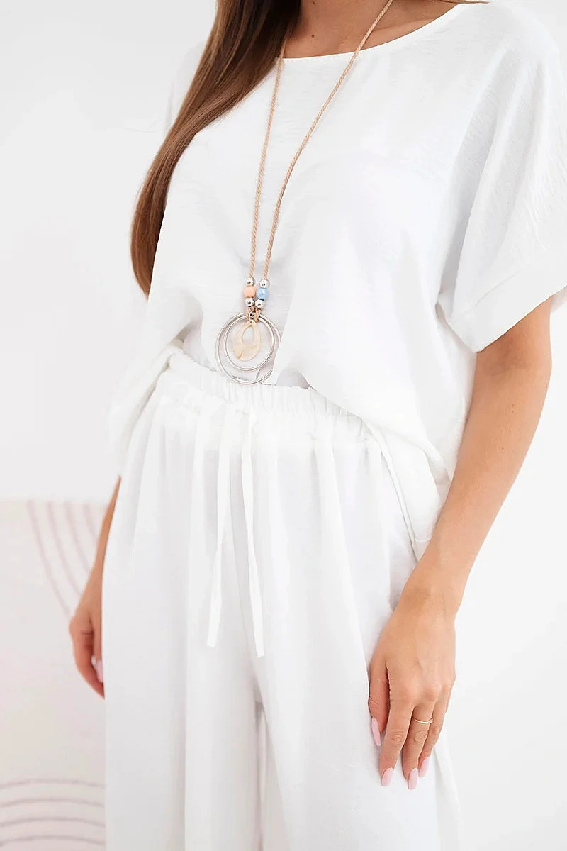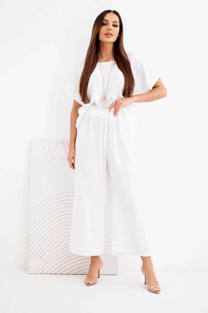Dámský viskózový komplet: halenka s krátkým rukávem a kalhoty se širokou nohavicí ecru