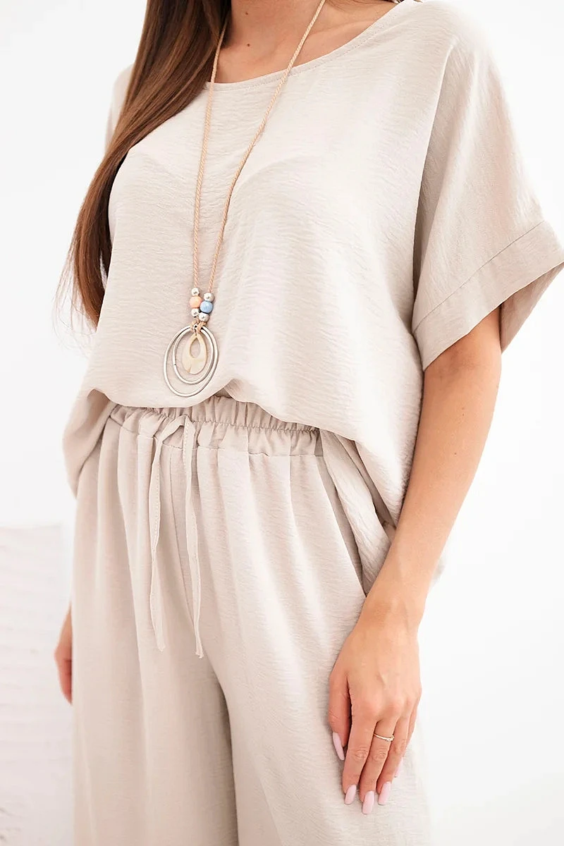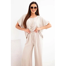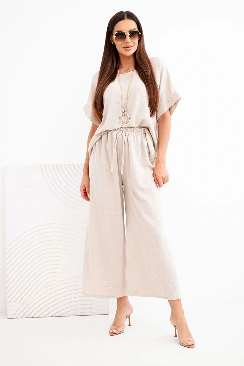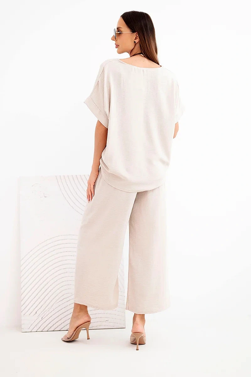 Dámský viskózový komplet — halenka s krátkým rukávem a kalhoty se širokou nohavicí tmavě béžový