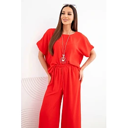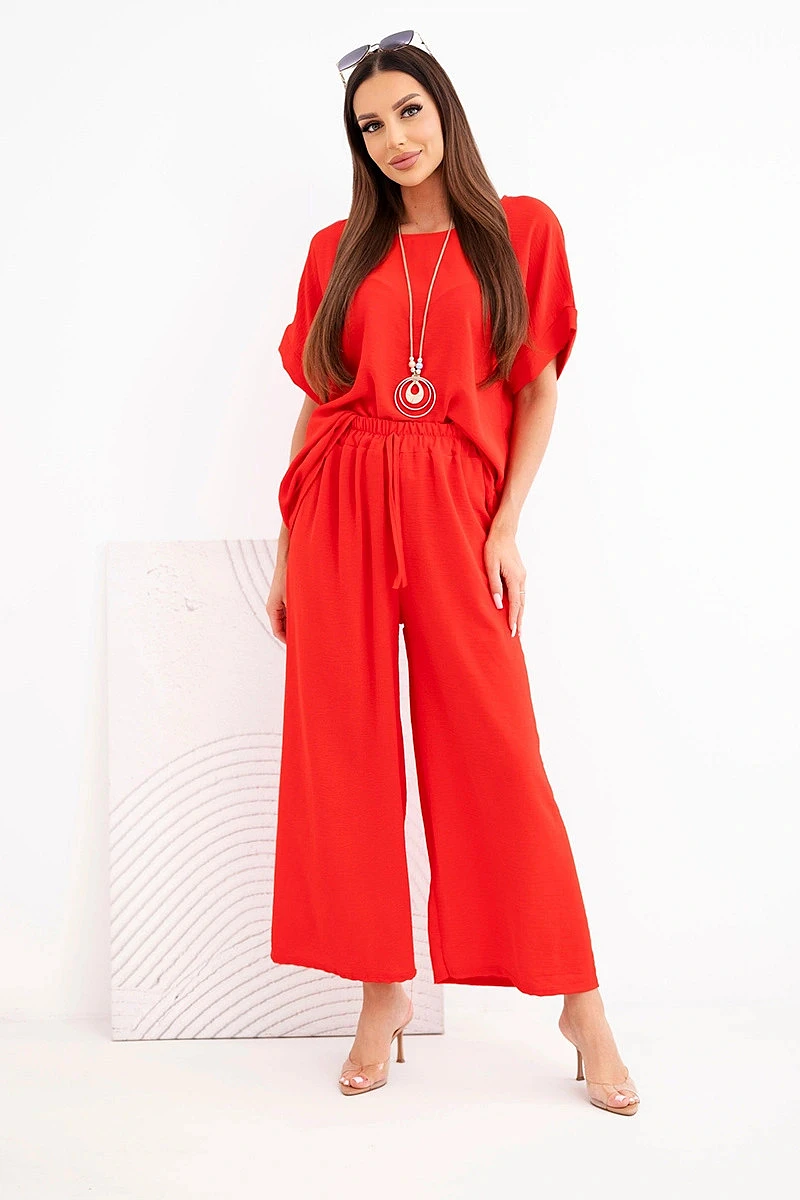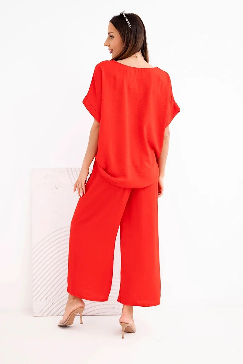 Dámský viskózový komplet halenka s krátkým rukávem a kalhoty se širokými nohavicemi červený