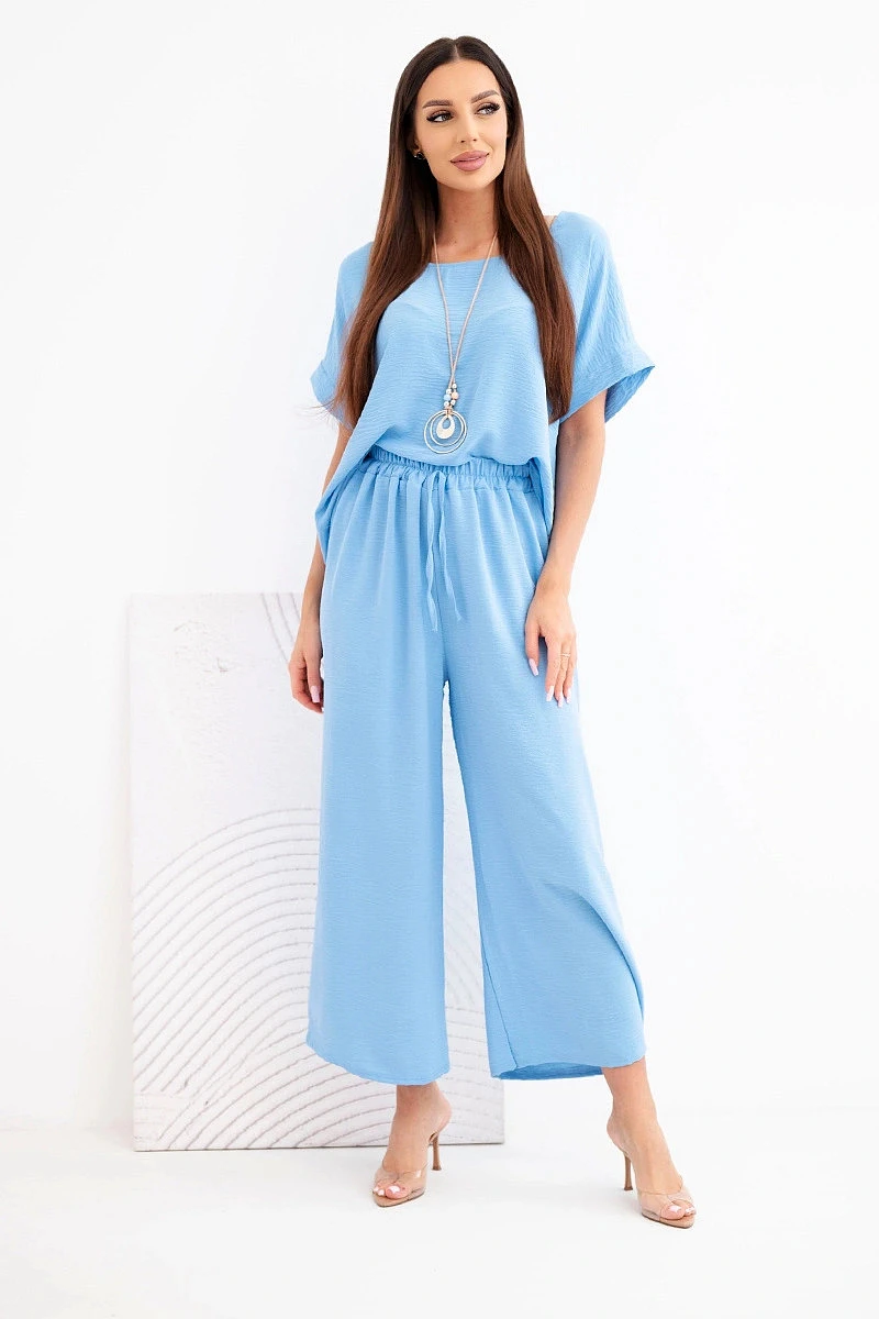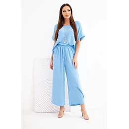 Dámský viskózový komplet halenka s krátkým rukávem a kalhoty se širokými nohavicemi modrá