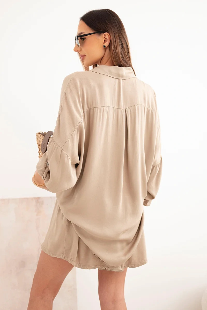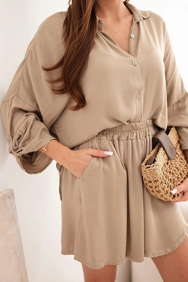 Dámský viskózový komplet, košile s knoflíky a volné kraťasy camelový