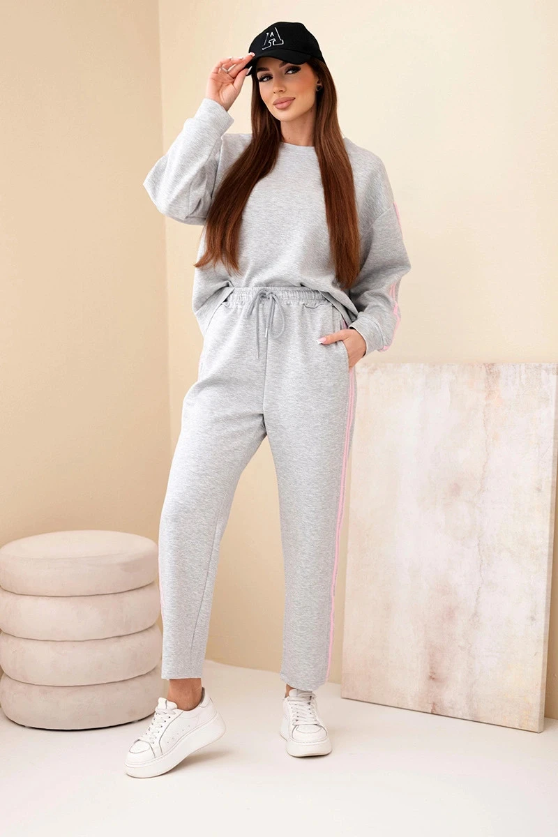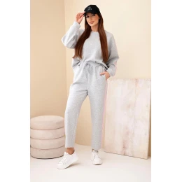 Stylová dámská tepláková souprava je ideální volbou pro ženy, které si cení pohodlí a módního vzhledu v každodenních outfitech. Souprava se skládá z volné mikiny s dlouhým rukávem a kalhot s elastickým pasem a efektními lampasy po bocích. Je to skvělá volba jak na každý den, do práce v neformálním stylu, tak na procházku nebo výlet.