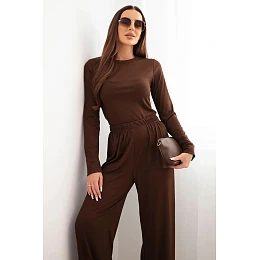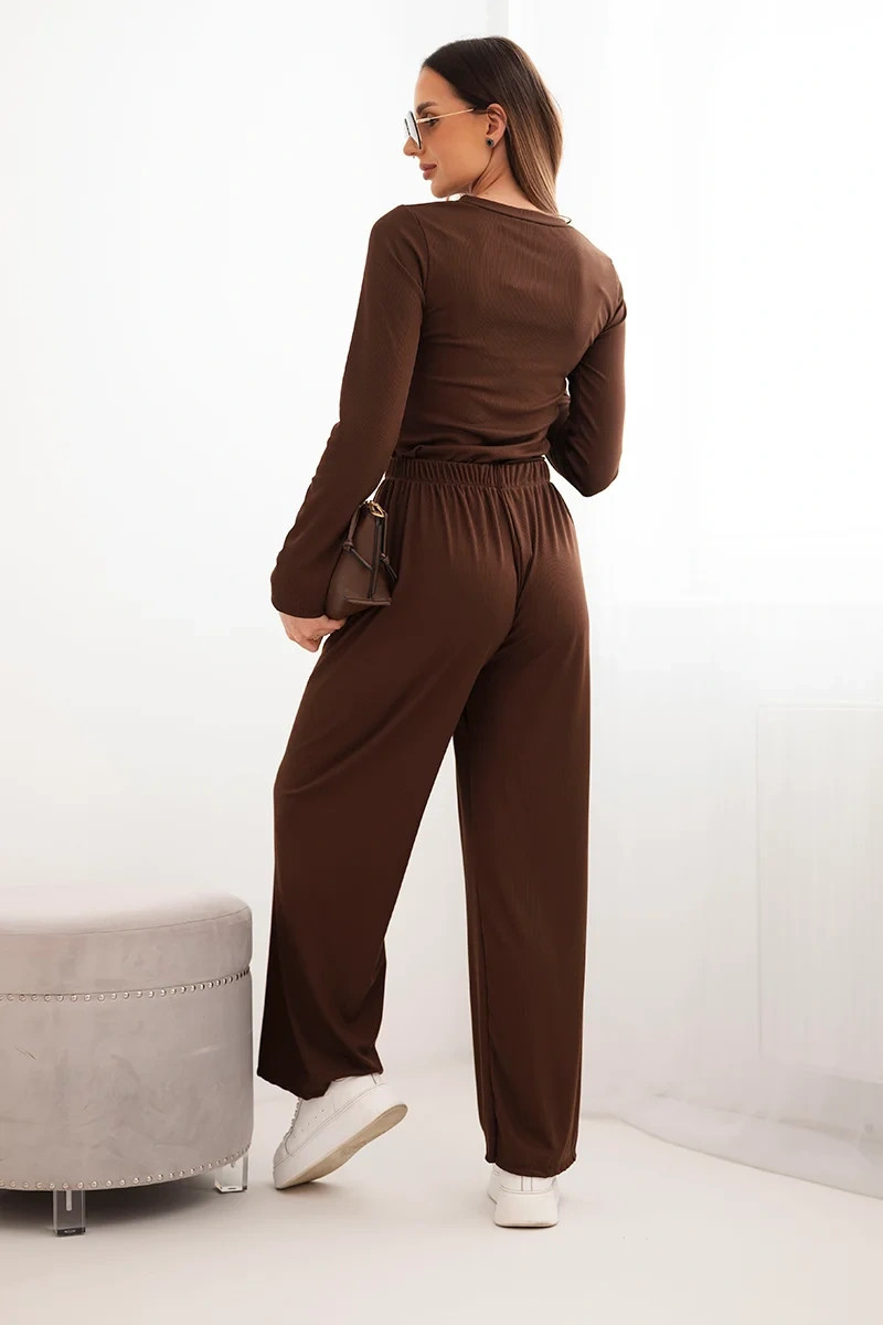 Dámský viskózový komplet s blůzou a širokými kalhotami hnědý