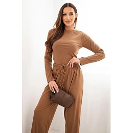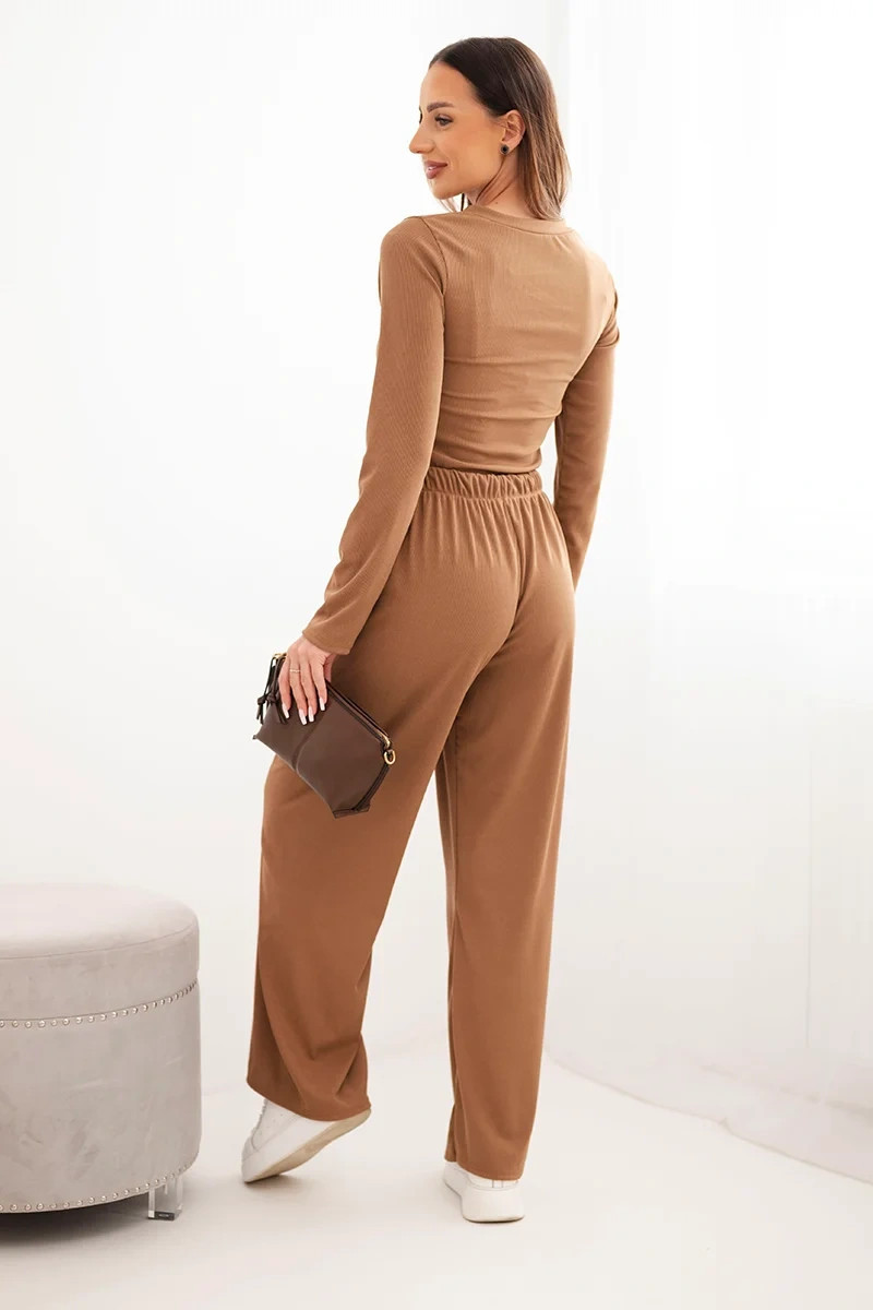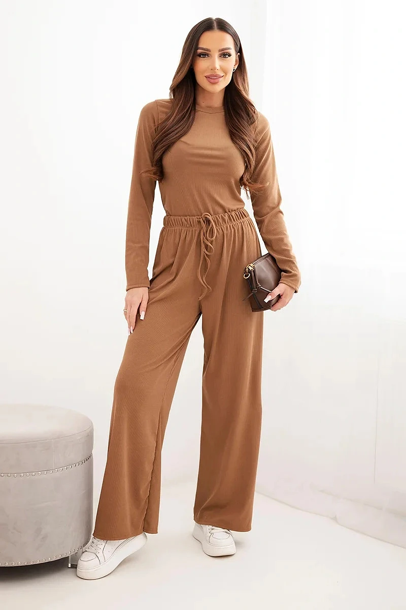 Dámský viskózový komplet s halenkou a širokými kalhotami camelový