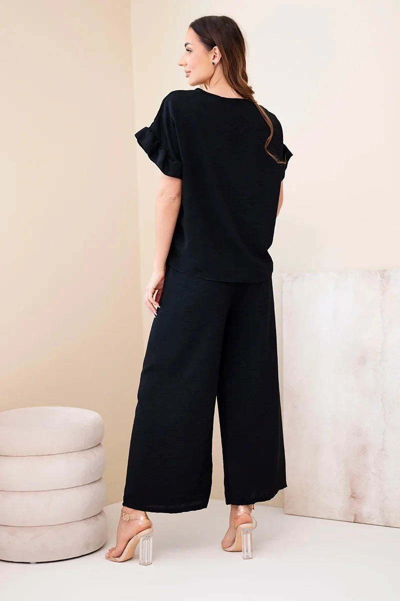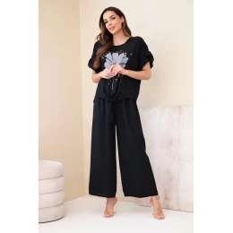 Dámský viskózový komplet s halenkou s potiskem a kalhotami černý