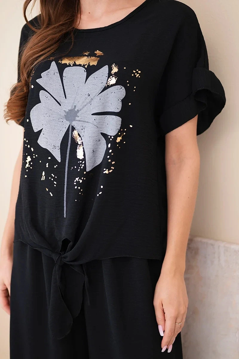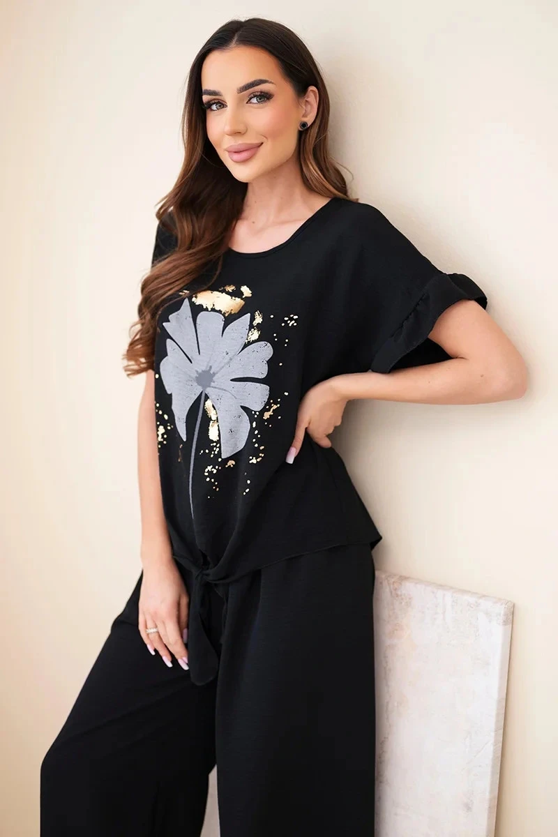 Stylový dámský komplet je vynikající volbou pro ženy, které si cení pohodlí a módního vzhledu. Set se skládá z volného topu s krátkým rukávem a širokých kalhot s komfortním střihem. Top vyniká efektním květinovým potiskem a asymetrickým spodním lemem, který dodává celku moderní a originální charakter.