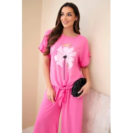 Stylový dámský komplet je vynikající volbou pro ženy, které si cení pohodlí a módního vzhledu. Set se skládá z volného topu s krátkým rukávem a širokých kalhot s komfortním střihem. Top vyniká efektním květinovým potiskem a asymetrickým spodním lemem, který dodává celku moderní a originální charakter.