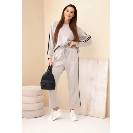 Stylová dámská tepláková souprava je ideální volbou pro ženy, které si cení pohodlí a módního vzhledu v každodenních outfitech. Souprava se skládá z volné mikiny s dlouhým rukávem a kalhot s elastickým pasem a efektními lampasy po bocích. Je to skvělá volba jak na každý den, do práce v neformálním stylu, tak na procházku nebo výlet.