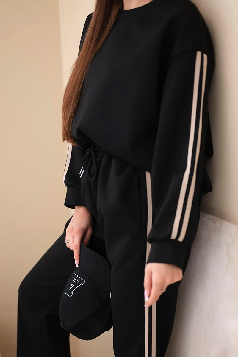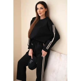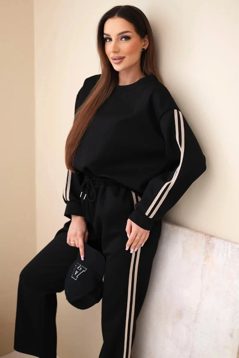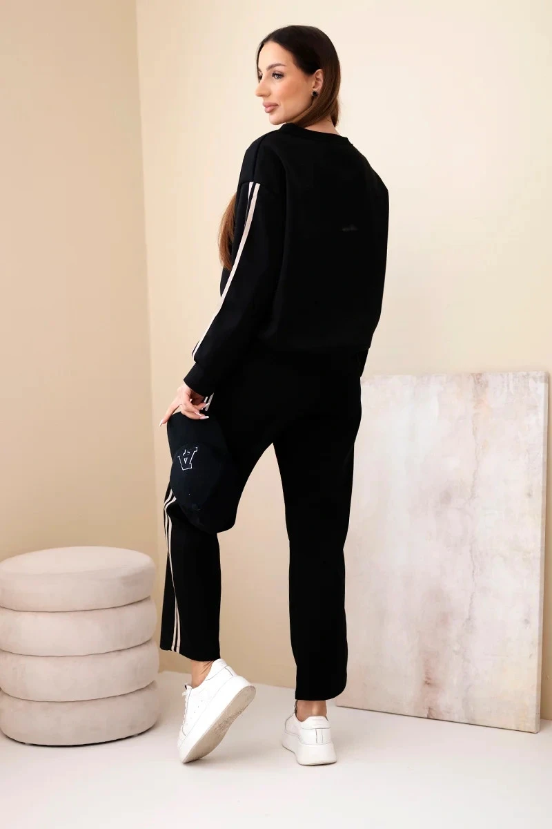Stylová dámská tepláková souprava je ideální volbou pro ženy, které si cení pohodlí a módního vzhledu v každodenních outfitech. Souprava se skládá z volné mikiny s dlouhým rukávem a kalhot s elastickým pasem a efektními lampasy po bocích. Je to skvělá volba jak na každý den, do práce v neformálním stylu, tak na procházku nebo výlet.