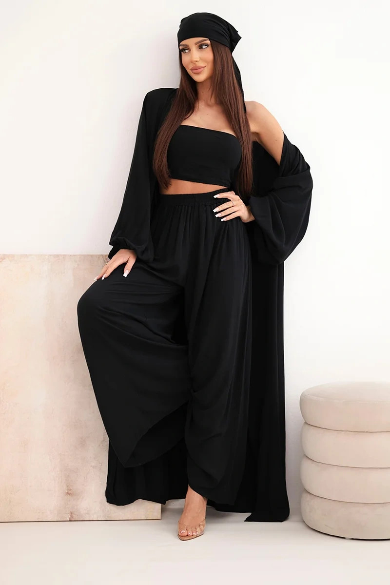 Dámský viskózový komplet je vynikající volbou pro ženy, které ocení pohodlí, lehkost a výjimečný styl. Tento efektní set se skládá z topu, širokých kalhot, dlouhého přehozu a šály, díky čemuž vytváří soudržnou a velmi ženskou stylizaci. Lehký materiál se krásně přizpůsobí postavě, zvýrazní její přednosti a zajišťuje plné pohodlí při nošení i v teplejších dnech. Model se skvěle hodí na prázdninové výlety, procházky, letní setkání, ale také na výjimečné příležitosti, kdy chcete vypadat módně a stylově, aniž byste se vzdaly pohodlí.