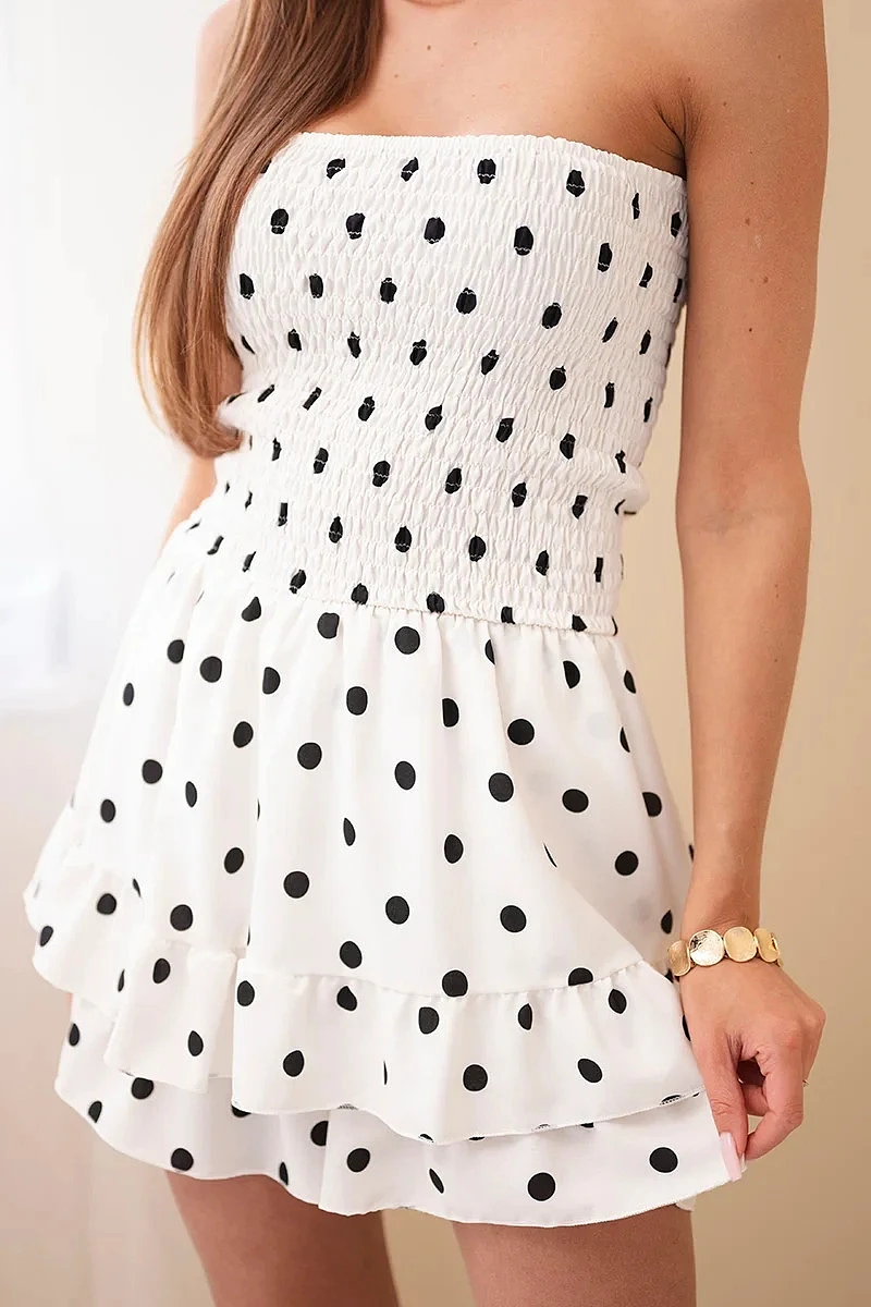 Stylový a mimořádně ženský dámský overal ve střihu španělky je ideální volbou na teplé dny. Model vyniká elastickým, řaseným vrškem, který se skvěle přizpůsobí postavě a zvýrazní poprsí i pas. Odhalená ramena dodávají celku lehkost a jemnou eleganci, zatímco volnější spodní část zakončená volánem přidává půvab a volnost pohybu. Vzor v nadčasové puntíky způsobuje, že overal působí módně a svěže a skvěle zapadá do letních trendů.