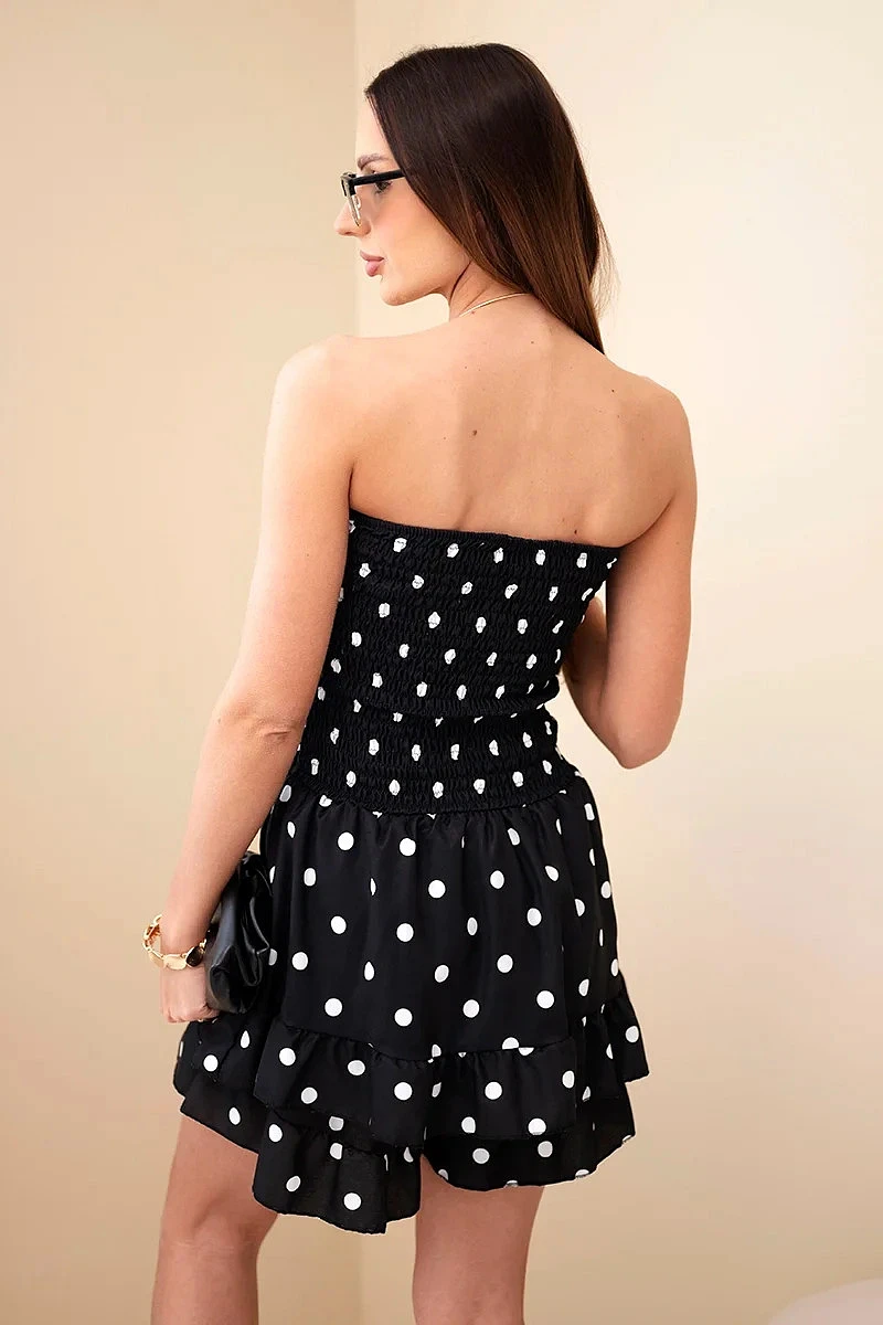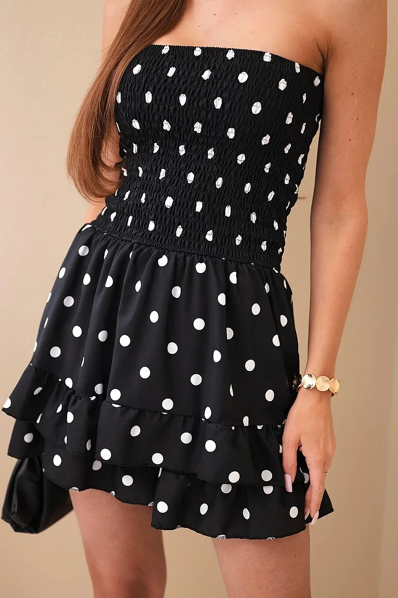 Stylový a mimořádně ženský dámský overal ve střihu španělky je ideální volbou na teplé dny. Model vyniká elastickým, řaseným vrškem, který se skvěle přizpůsobí postavě a zvýrazní poprsí i pas. Odhalená ramena dodávají celku lehkost a jemnou eleganci, zatímco volnější spodní část zakončená volánem přidává půvab a volnost pohybu. Vzor v nadčasové puntíky způsobuje, že overal působí módně a svěže a skvěle zapadá do letních trendů.