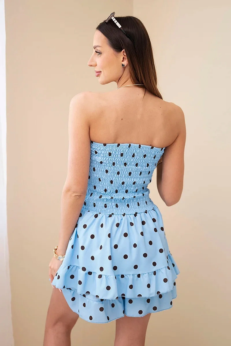 Stylový a mimořádně ženský dámský overal ve střihu španělky je ideální volbou na teplé dny. Model vyniká elastickým, řaseným vrškem, který se skvěle přizpůsobí postavě a zvýrazní poprsí i pas. Odhalená ramena dodávají celku lehkost a jemnou eleganci, zatímco volnější spodní část zakončená volánem přidává půvab a volnost pohybu. Vzor v nadčasové puntíky způsobuje, že overal působí módně a svěže a skvěle zapadá do letních trendů.