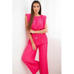 Dámský viskózový plisovaný komplet s vázací halenkou a širokými kalhotami růžový