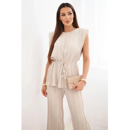 Dámský viskózový plisovaný komplet s vázanou halenkou a širokými kalhotami béžový