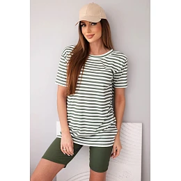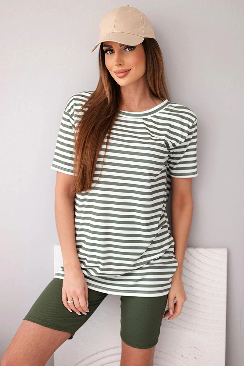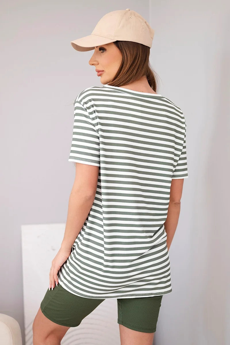Dámský viskózový pruhovaný komplet s krátkým rukávem a kraťasy khaki