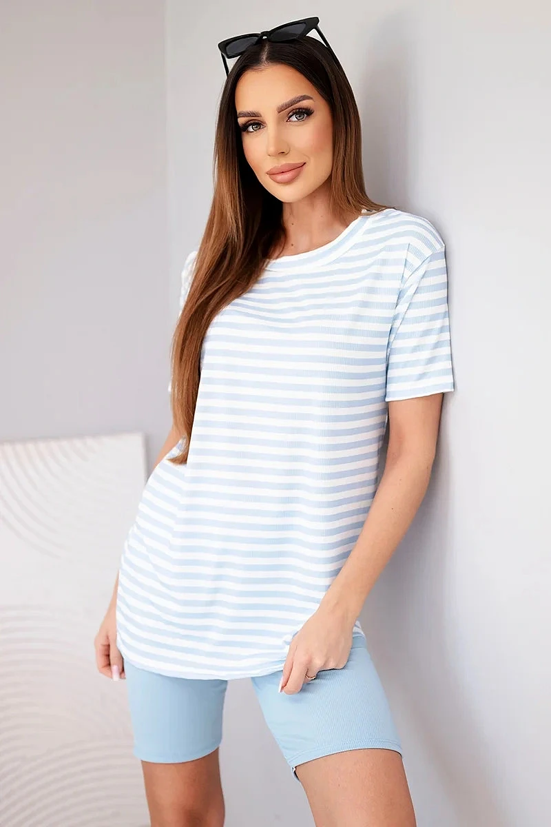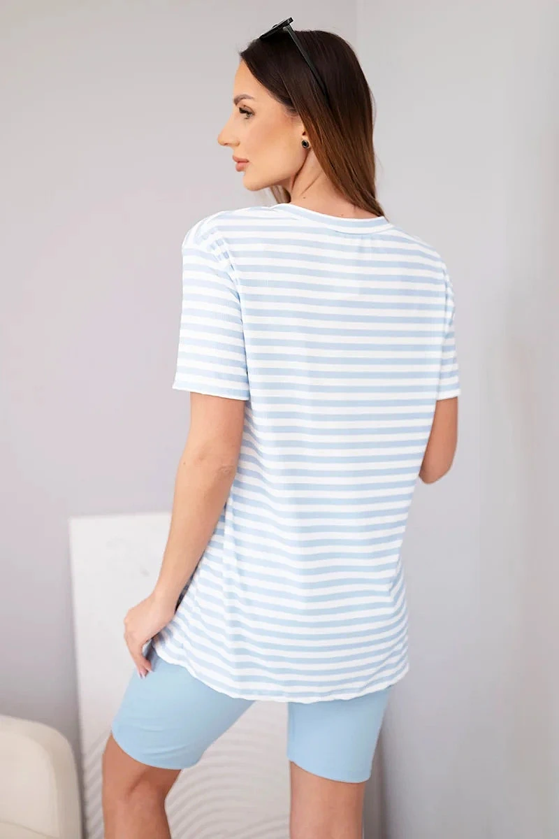Dámský viskózový pruhovaný komplet s krátkým rukávem a kraťasy modrý