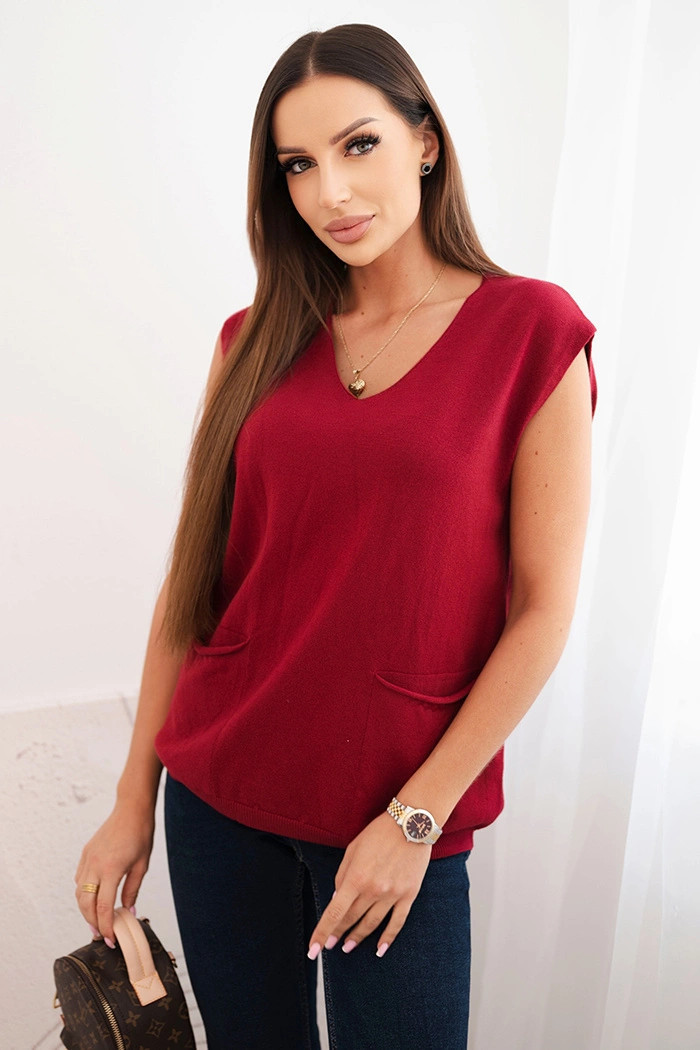 Dámský viskózový svetr bez rukávů s kapsami a V výstřihem bordový