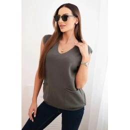 Dámský viskózový svetr bez rukávů s kapsami a výstřihem do V khaki