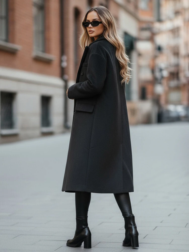 Černý dámský kabát v klasické edici s mírně nadměrným střihem je nadčasovou nabídkou pro ženy, které ocení eleganci a jednoduchost. Dvouřadé zapínání na knoflíky mu dodává elegantní vzhled, zatímco široké klopy límce zdůrazňují jeho stylový charakter. Díky rovnému střihu a délce ke kolenům model dokonale sedí na siluetě, zatímco praktické kapsy s klopami zvyšují jeho funkčnost.