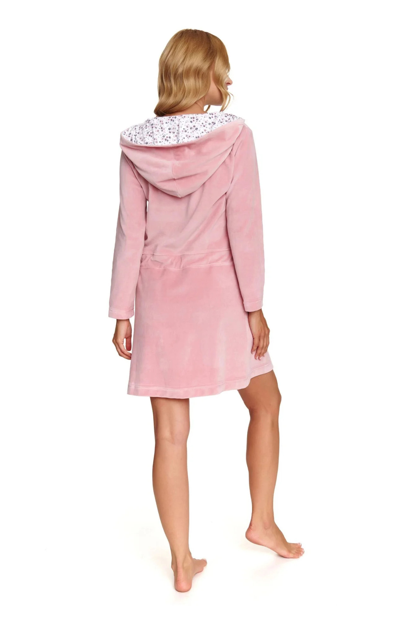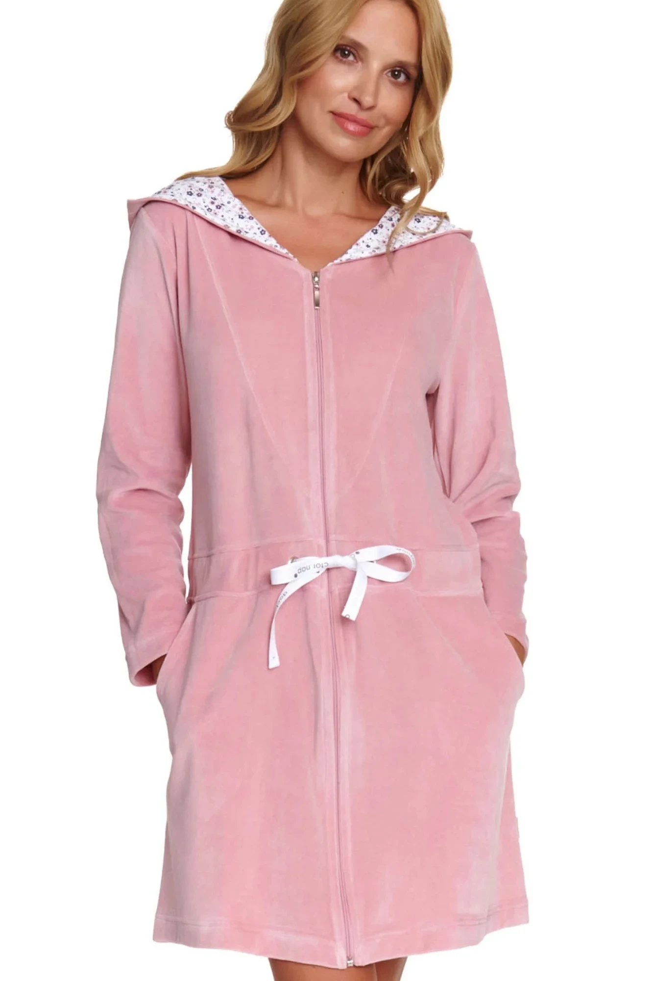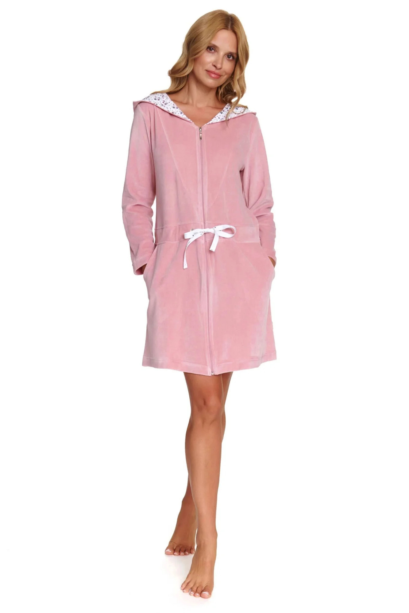 Dámský župan 1008 papaya Doctornap - růžová barva - z vysoce jakostní bavlny - s kapsami - zapínání na zip - praktická šňůrka v pase - s kapucí - délka nad kolena - certifikát OEKO-TEX Standard 100