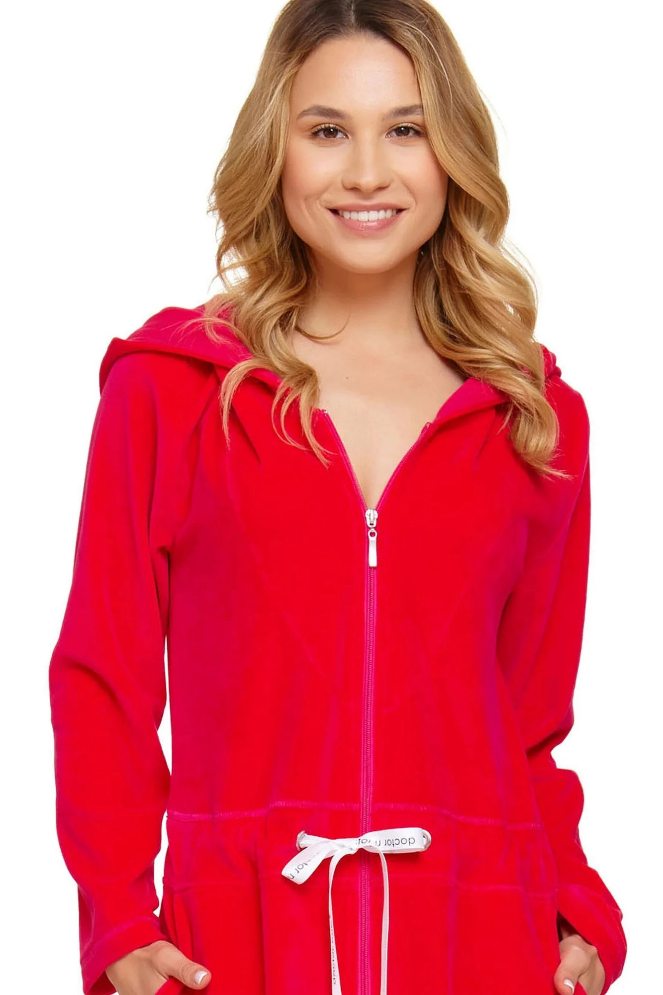 Dámský župan 1008 red Doctornap - červená barva - z vysoce jakostní bavlny - s kapsami - zapínání na zip - praktická šňůrka v pase - s kapucí - délka nad kolena - certifikát OEKO-TEX Standard 100