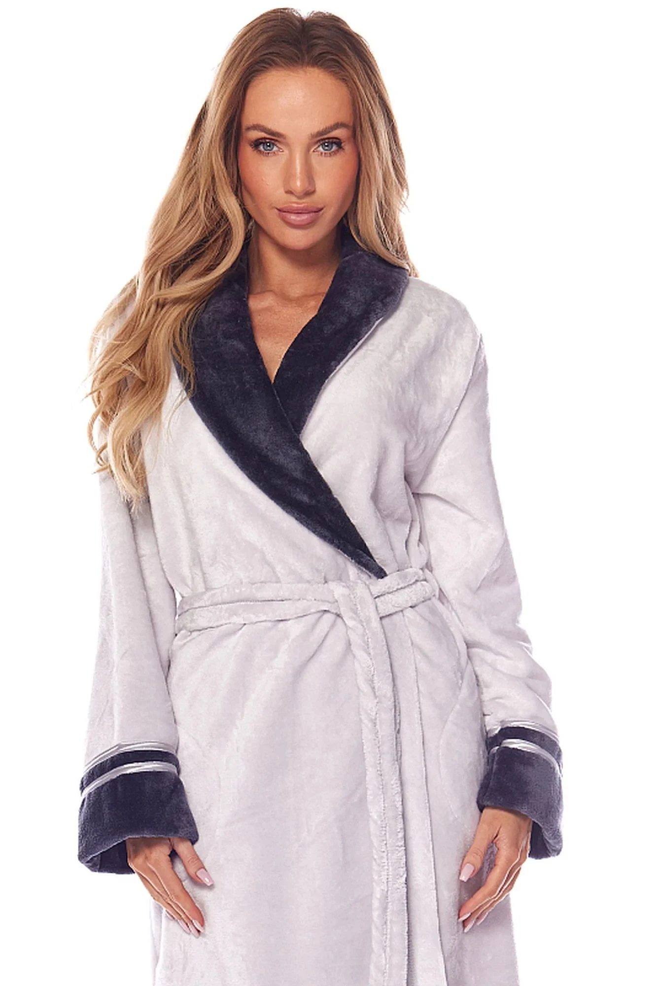 Dámský dlouhý župan 2206 Claudia L&L - velmi měkký a příjemný materiál na dotek - perleťová barva - na bocích našité kapsy - zavazování na pásek - kontrastní lemováníMateriálové složení: 100% polyester
