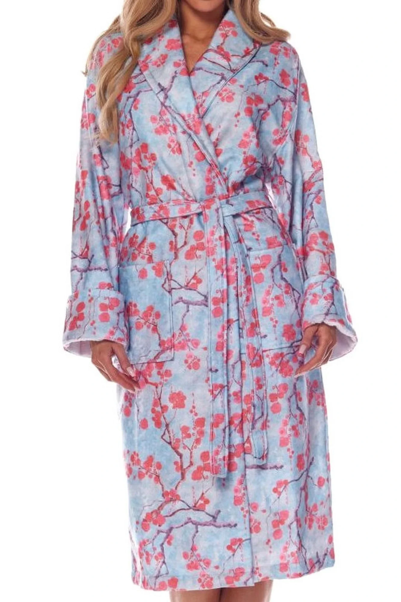 Dámský župan 2216 Fida L&L - světle modrá barva - z měkkého materiálu s přídavkem bambusu - s potiskem - kapsy a v pase vázání na pásek - s šálovým límcem - dlouhýMateriálové složení: 50% polyester + 50% bambus