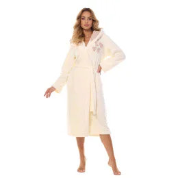 Dámský župan 2410 LV cream L&L - krémová barva - z měkkého materiálu typu soft - s potiskem - na prsou ozdobná výšivka - dlouhé rukávy zakončené manžetami - kapsy na bocích - s kapucí - v pase vázání na pásek - dlouhýMateriálové složení: 100% polyester