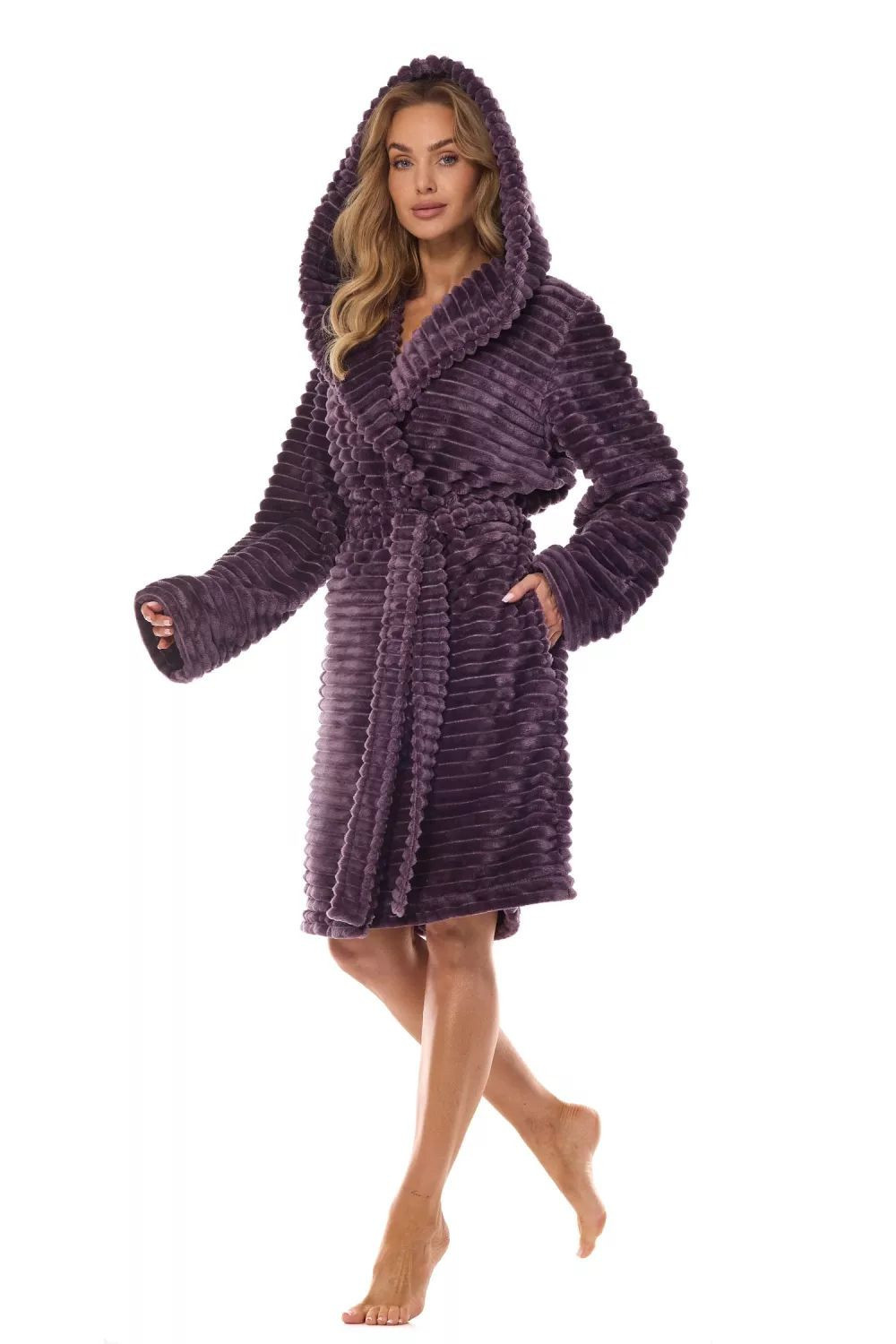 Dámský župan 2416 Robin violet L&L - fialová barva - z měkkého materiálu typu soft - protlačený vzor - na bocích kapsy - zavazování v pase na pásek - s kapucí - krátký