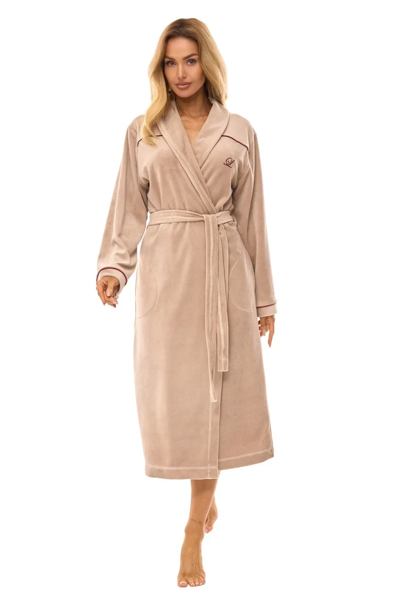 Seznamte se s výjimečným dámským županem 2508, který kombinuje elegantní vzhled s pohodlným nošením. Je vyroben z vysoce kvalitních materiálů - měkké bavlny s příměsí polyesteru - dokonale obepíná tělo a poskytuje teplo a pohodlí kdykoli během dne. Klasický střih se šálovým límcem a dlouhými rukávy podtrhuje nadčasovou eleganci. Jemná výšivka a kontrastní lemování dodávají decentní šarm. Praktické kapsy a zavazování v pase zajišťují funkčnost. Ideální pro chladná rána a večery - doma, v hotelu nebo při relaxaci v lázních.
