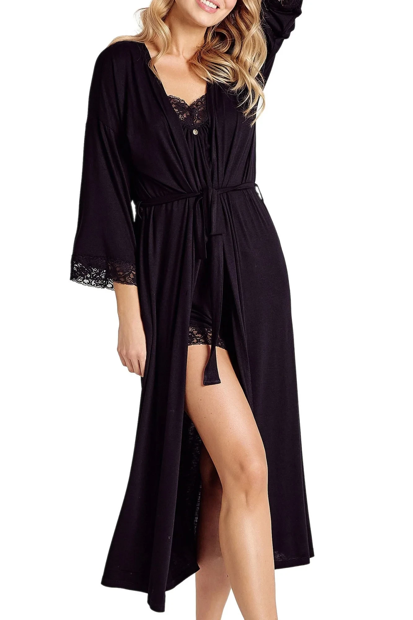 Dámský župan 3099 Mercy TARO - černá barva - z vysoce jakostní viskózy - tříčtvrteční rukávy zakončené krajkou - zavazování na pásekMateriálové složení: 94% viskóza + 6% elastan