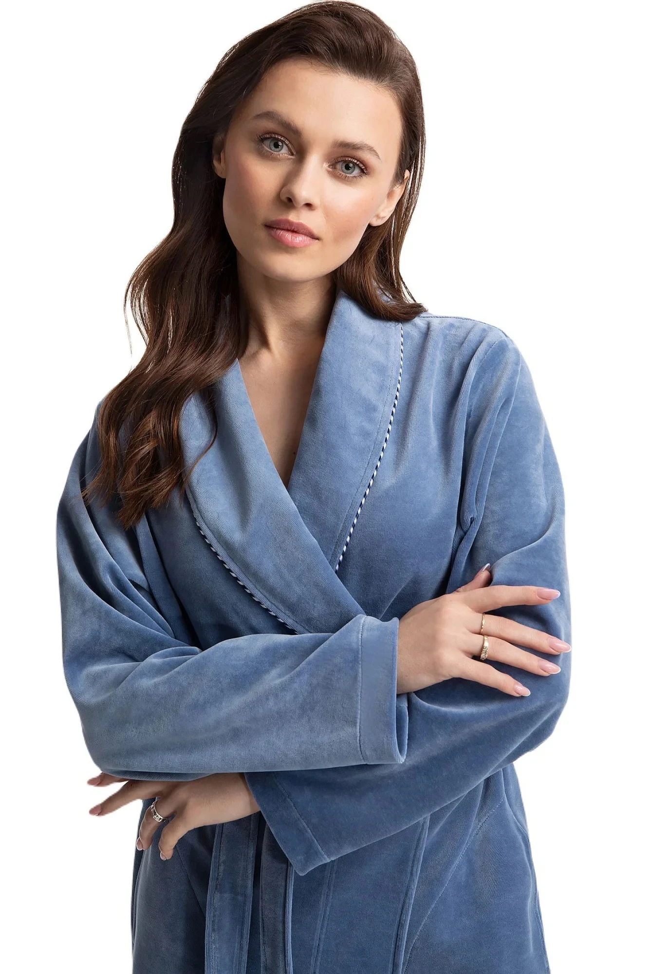 Dámský župan 371 Luna - světle modrá barva - z vysoce jakostní bavlny - veluru - šálový límec zakončený saténovým lemováním - na bocích kapsy - vázání v paseMateriálové složení: 82% bavlna + 18% polyester