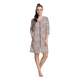 Kulatý výstřih zvýrazňuje dekolt a rukávy ve 3/4 délce zajišťují volnost pohybu, zatímco praktické kapsy poskytují prostor pro drobnosti, jako je telefon nebo kapesníky. Díky pohodlnému zapínání na zip je tento župan ideální jak pro domácí odpočinek, tak pro ranní přípravu.