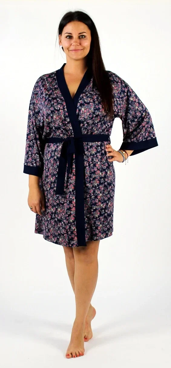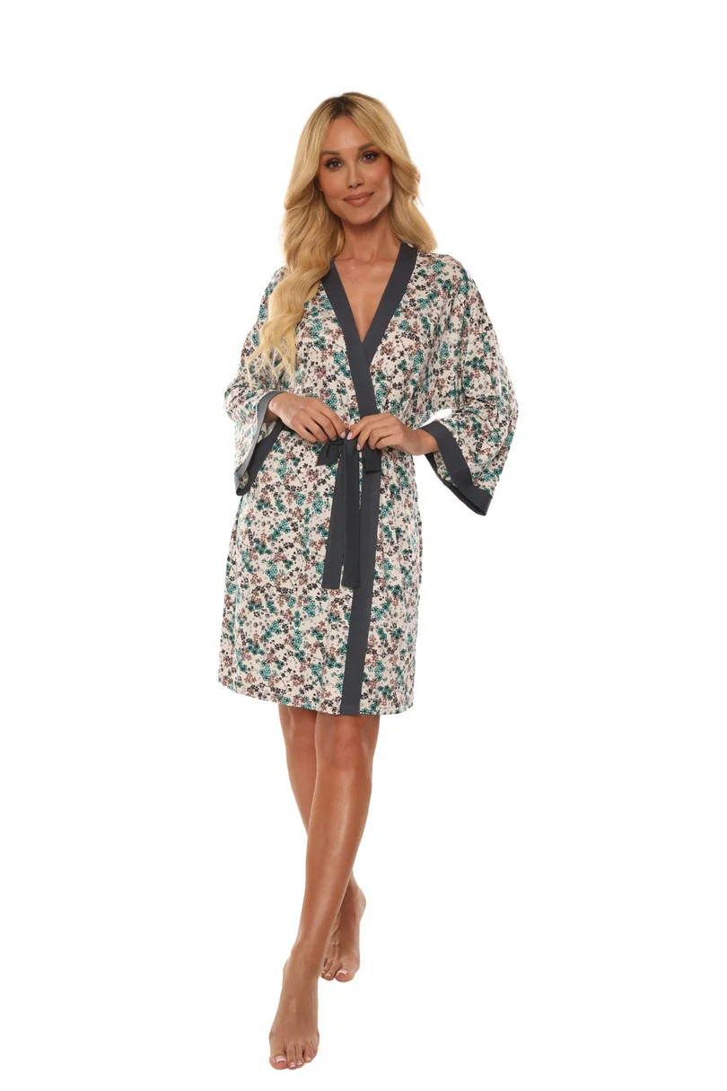 Szlafrok damski cienki wykonany z wzorzystej wiskozy. Rękaw typu kimono. Wiązany w pasie, na wysokości bioder wygodne kieszenie.