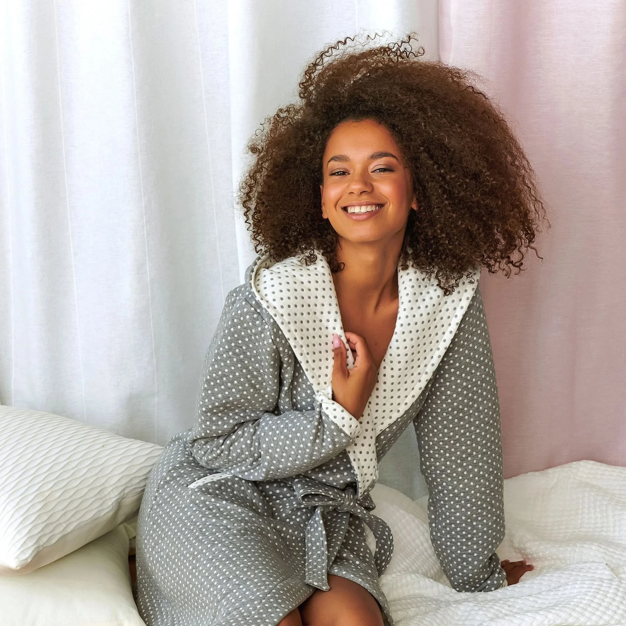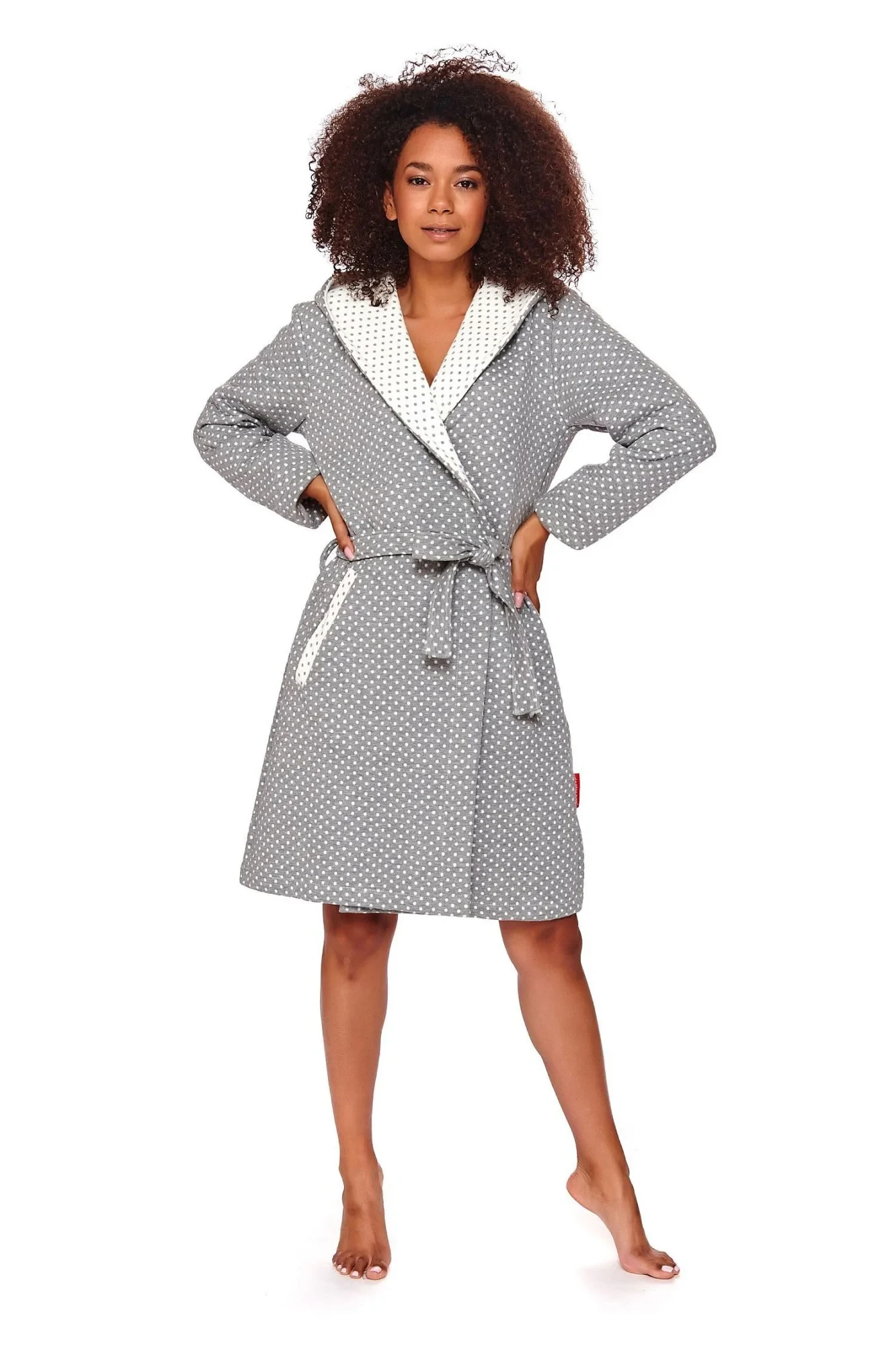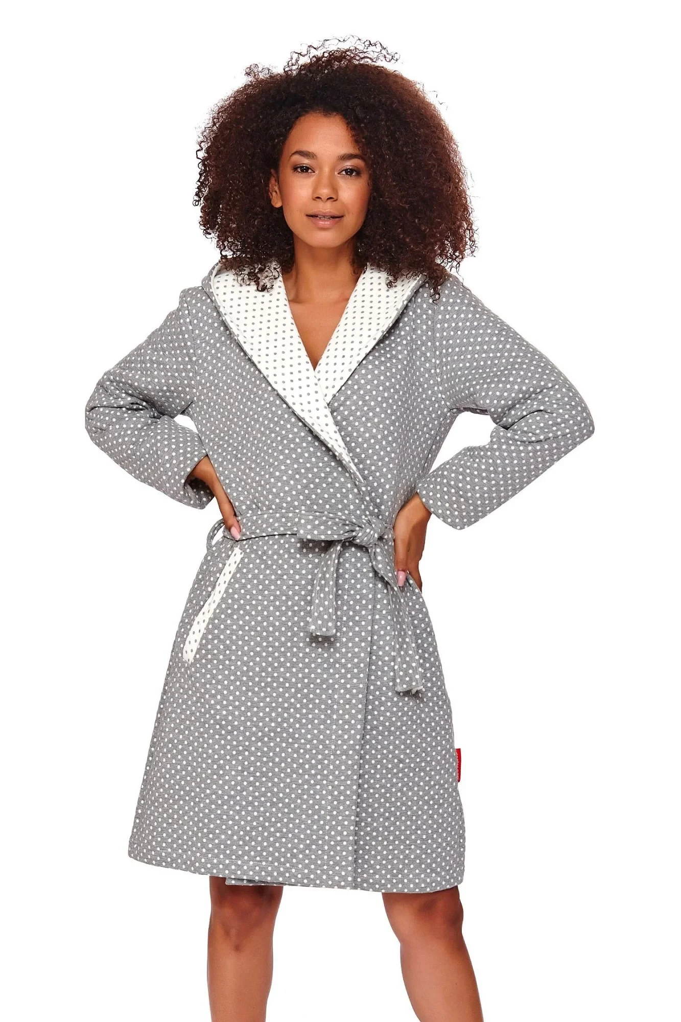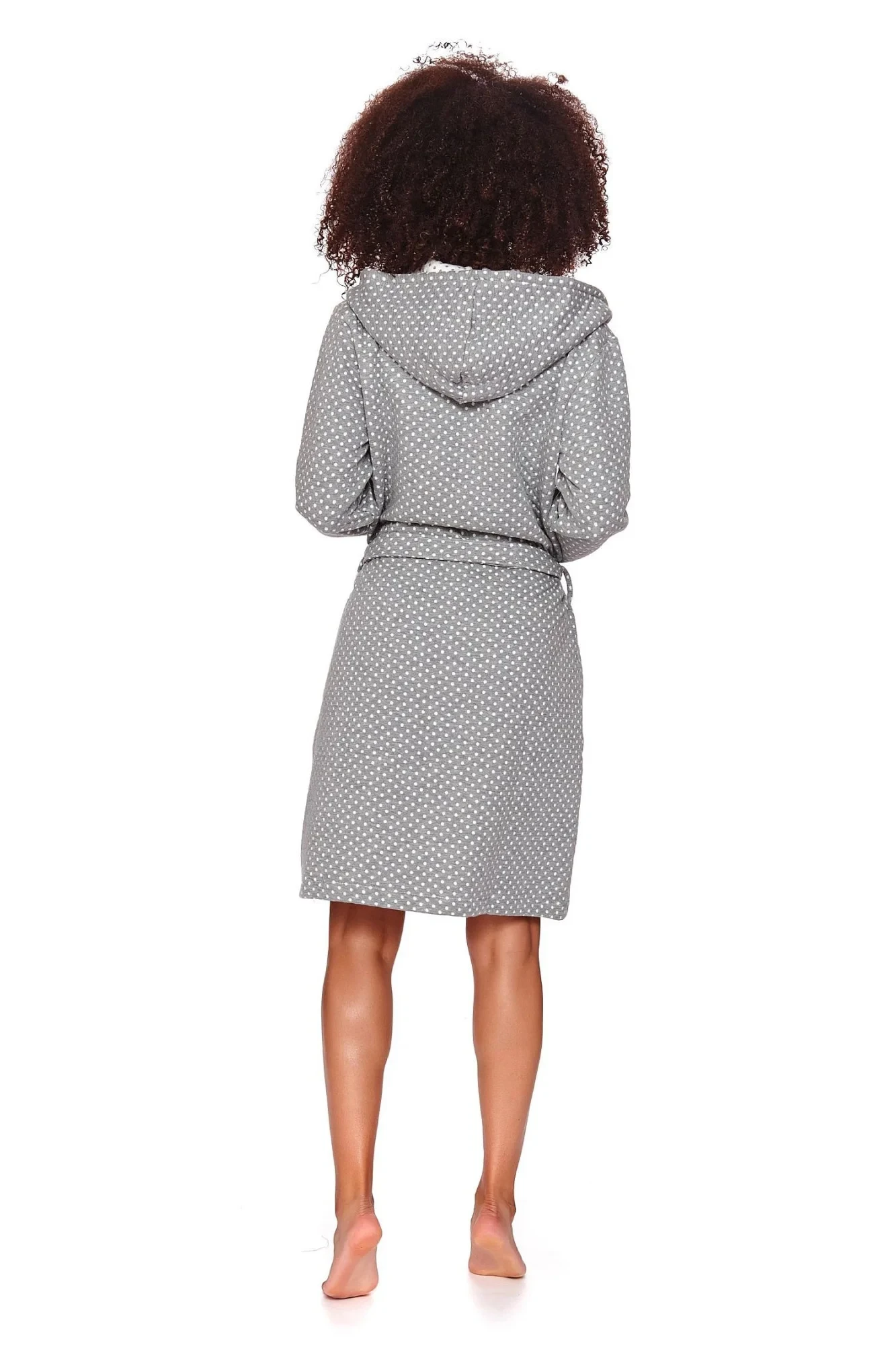 Dámský župan 8030 Doctornap - šedá barva - z vysoce jakostní bavlny - s bílými puntíky - dlouhé rukávy - pohodlné kapsy na bocích - s kapucí - kontrastní lemování - zavazování na pásek