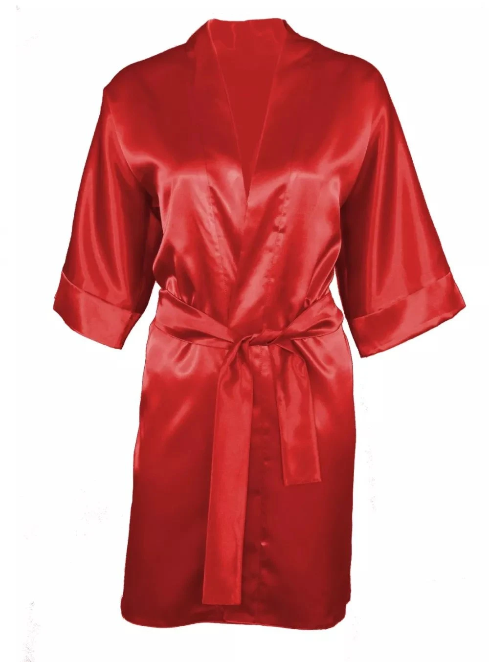 Pohodlný saténový župan 90 DKaren - červená barva - s jednoduchým střihem - kimonové rukávy - v pase na zavazování - ideální ke každé košilce