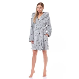 Dámský krátký župan 9135 L&L - ušitý z měkkého materiálu typu soft - šedá barva s grafitovými hvězdičkami - má kapsy a v pase vázání - s kapucí