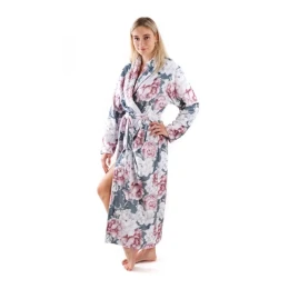 Aisha, dámský hřejivý župan s motivem pivoněk na šedém podkladu délka: 125cm S, 130cm M, 135cm L, 140cm XL, 145cm XXL střih: župan s límcem, kapsy v bočním švu , pásek velikosti: S,M,L,XL,XXL