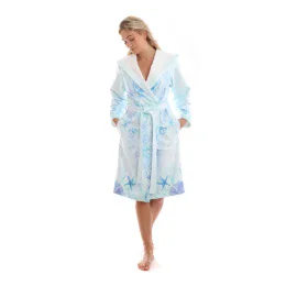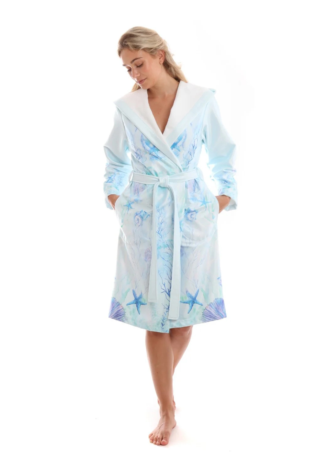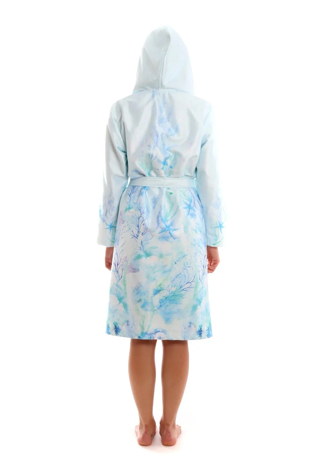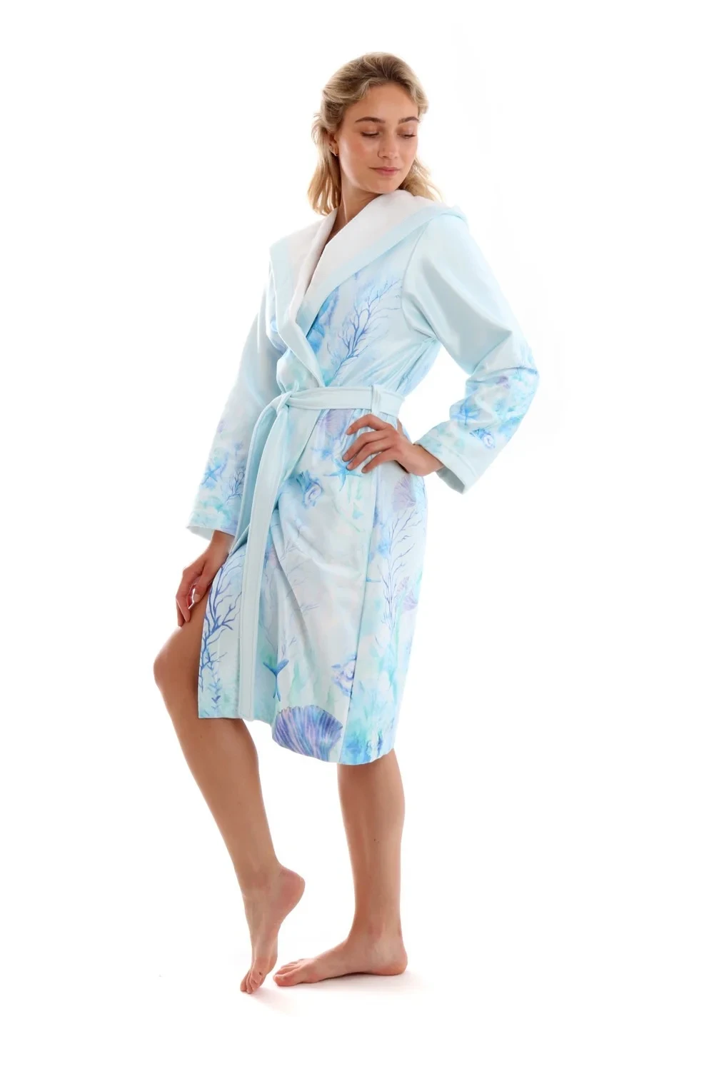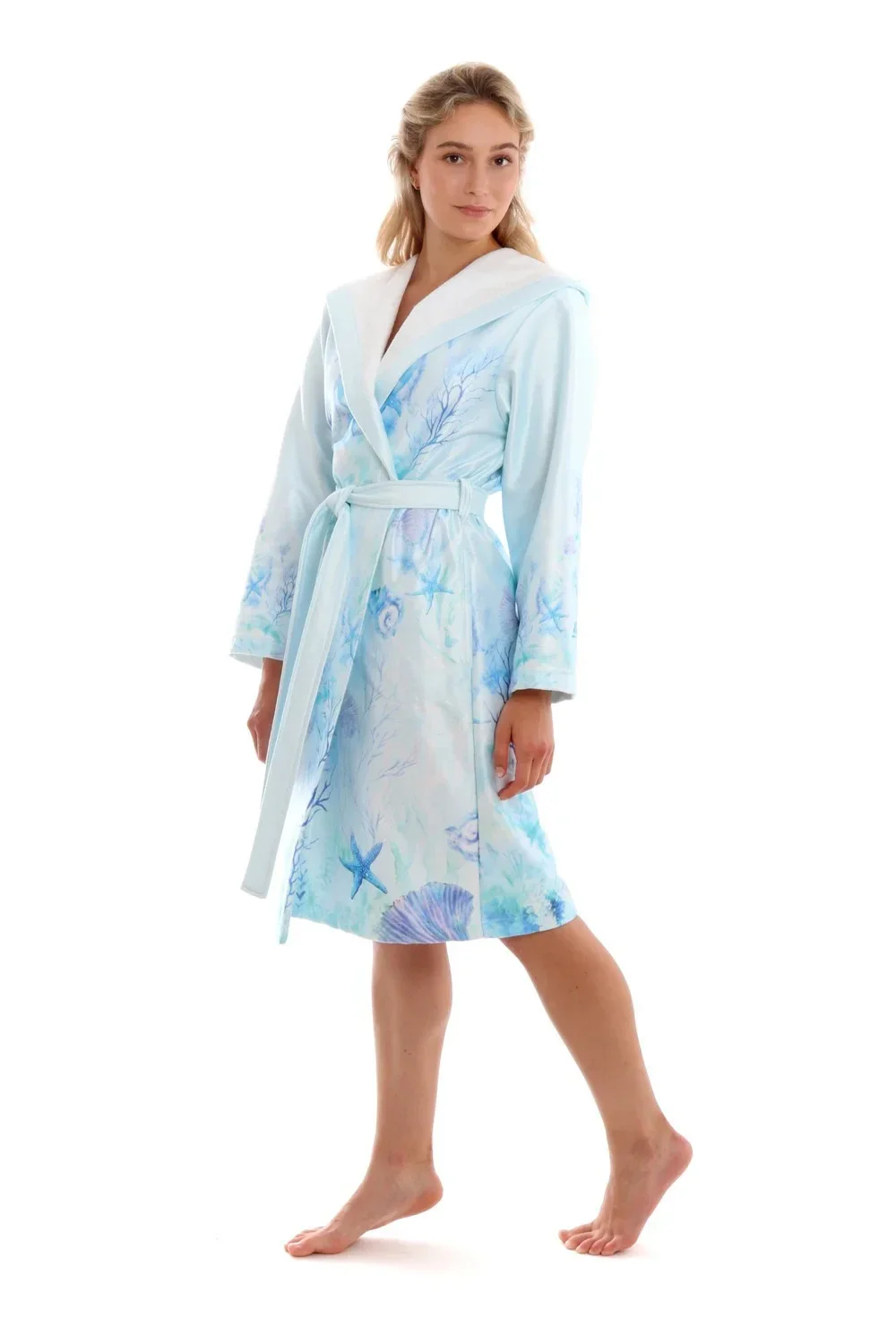 ANJU elegantní dámský župan s kapucí s krásným digitálním potiskem na téma mořský svět.