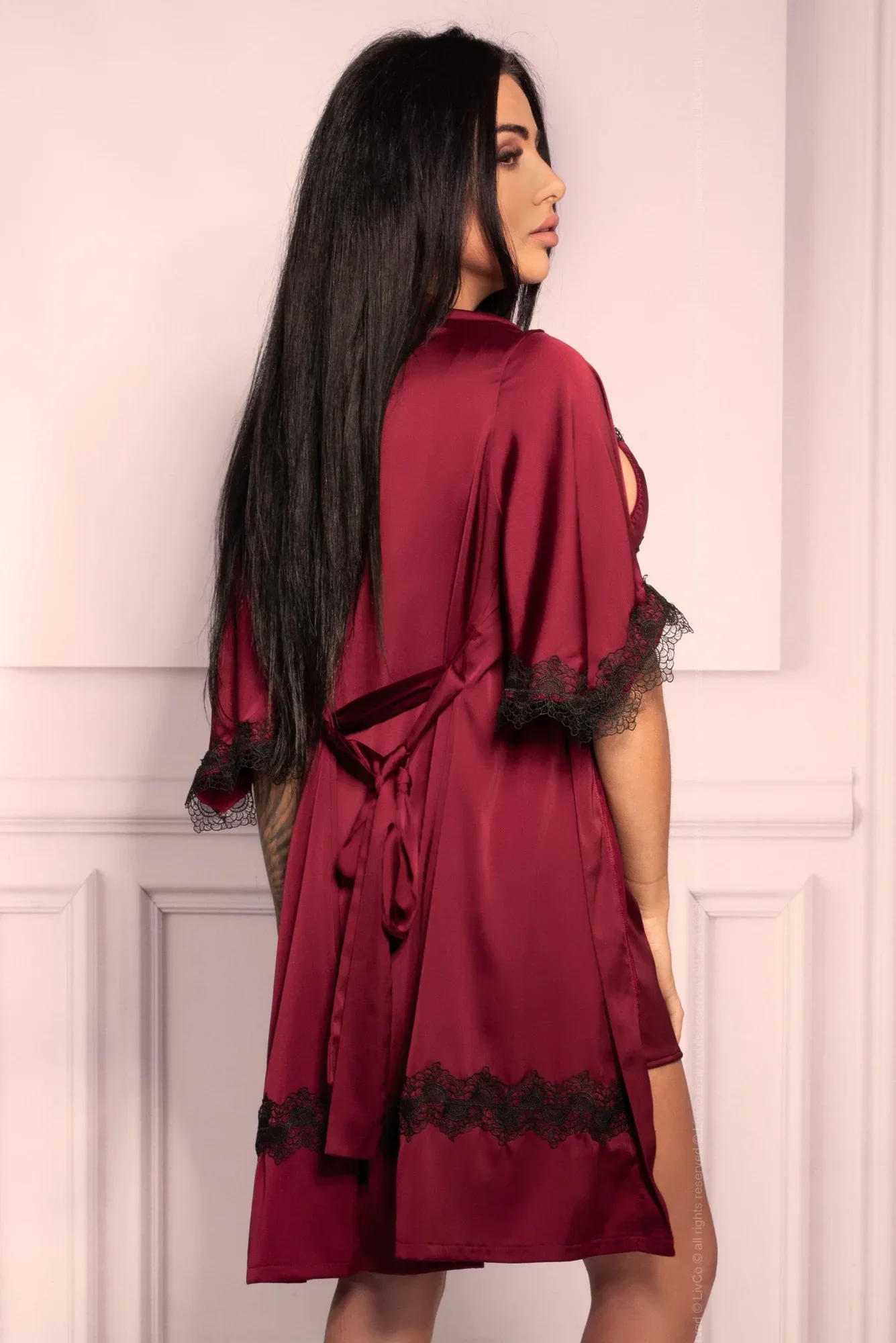 Třešňově vínový župan s krásným černým krajkovým zdobením na rukávech a linii stehen, vyrobený z lesklého saténu. Dekor s krásným, lehce orientálním výrazem. Pás je součástí dodávky. K sadě lze přiřadit tričko Lucami zobrazené na fotografii. Složení: 92 % polyester, 8 % elastan.