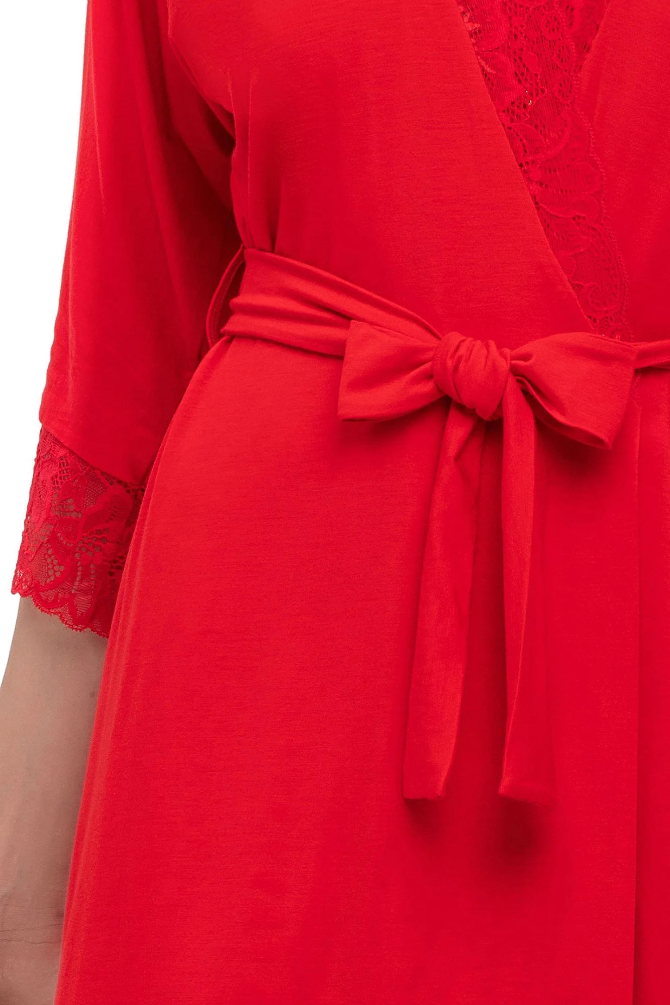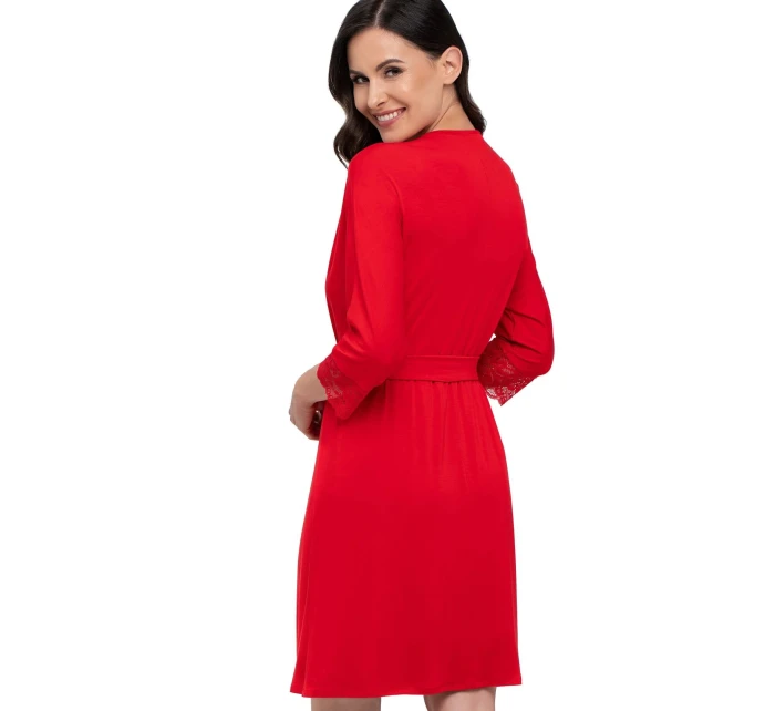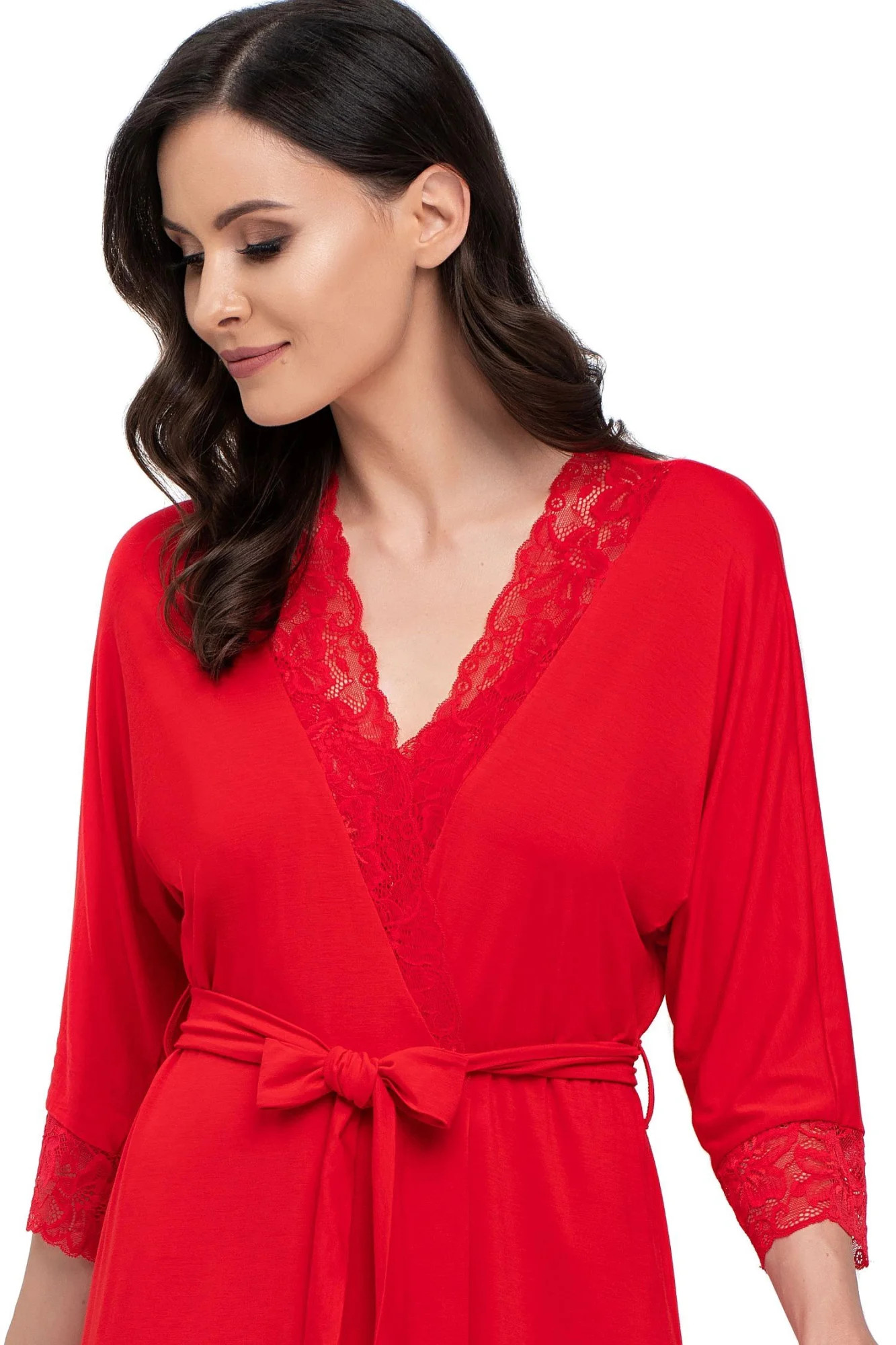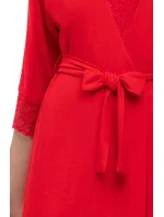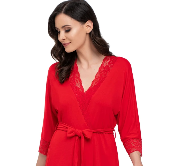 Hladký, černý župan s krajkovým lemováním ve výstřihu a na rukávech. Zavazuje se v pase, působí půvabně a velmi žensky. Vynikající kvalita - měkká, elastická viskóza příjemná na dotek. Složení: 94 % viskóza, 6 % elastan.