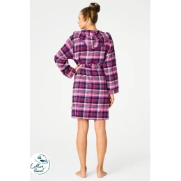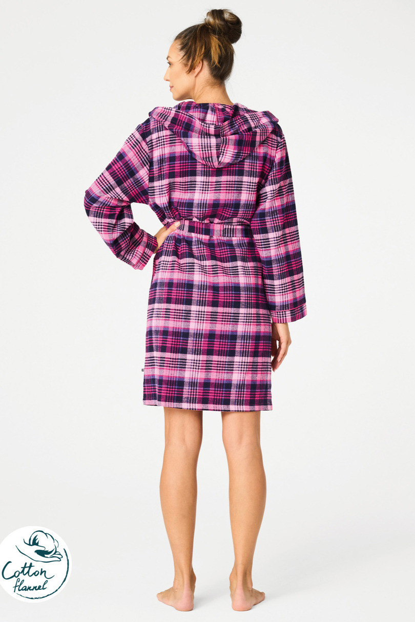 Szlafrok damski LGD 490 to połączenie ciepła, wygody i kobiecego stylu. Wykonany z wysokiej jakości bawełny flanelowej, jest wyjątkowo miękki i przyjemny w dotyku, a jednocześnie zapewnia doskonałą izolację cieplną w chłodniejsze dni. Klasyczny wzór w różowo-czarną kratę nadaje mu ponadczasowego uroku. Model posiada praktyczny kaptur chroniący przed chłodem, pasek do wiązania w talii oraz wygodne kieszenie, w których można ogrzać dłonie lub schować drobiazgi. Idealny do narzucenia po kąpieli, porannym prysznicu czy na relaksujący wieczór w domu.