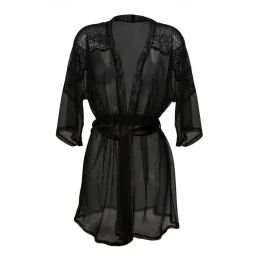 Velmi ženské splývavé negližé z černého elastického tylu, které lehce přiléhá k tělu, s krajkovými vsadkami na ramenou a černým saténovým zavazováním v pase. Plné krásy a půvabu! Složení: 100% polyester.